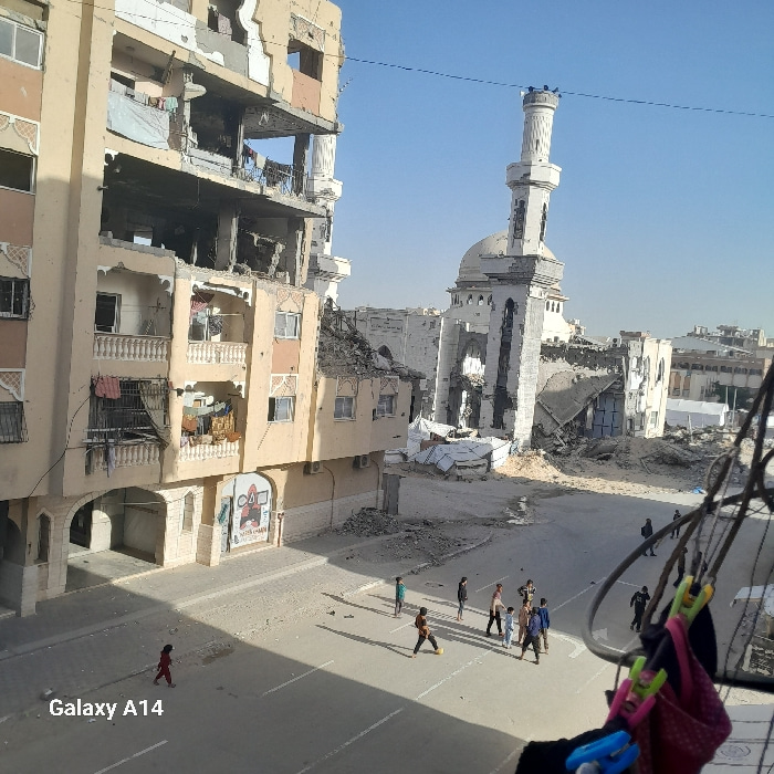The image depicts a street scene in Khan Yunis, Palestinian Territory, under clear daylight, viewed from an elevated position. On the left, a multi-story residential building, light beige in color, ex…read more