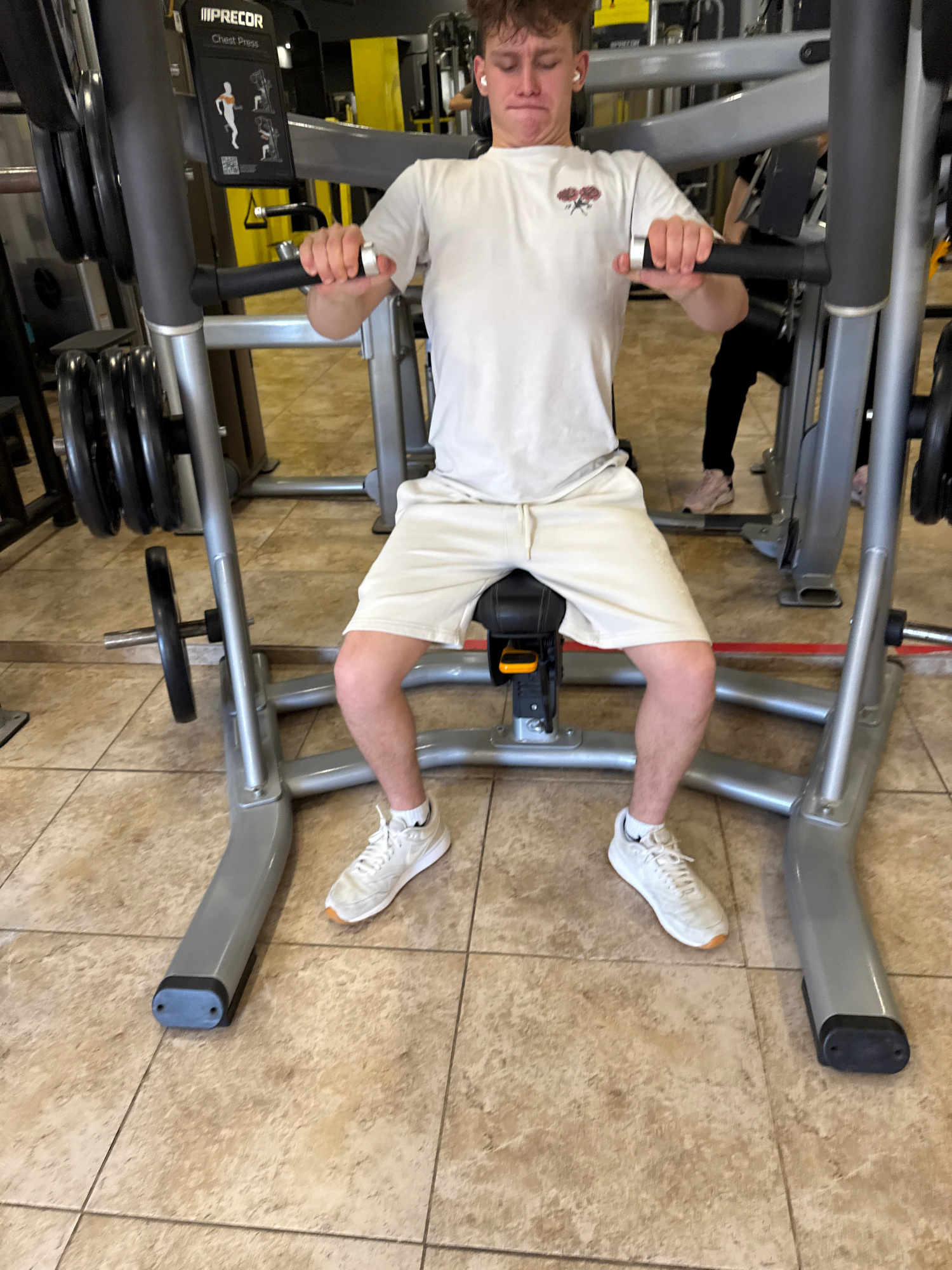 A young man in a white t-shirt and light-colored shorts is using a chest press machine in a gym. He is wearing white sneakers and has ear buds in his ears. The machine is a Precor model, as indicated…read more