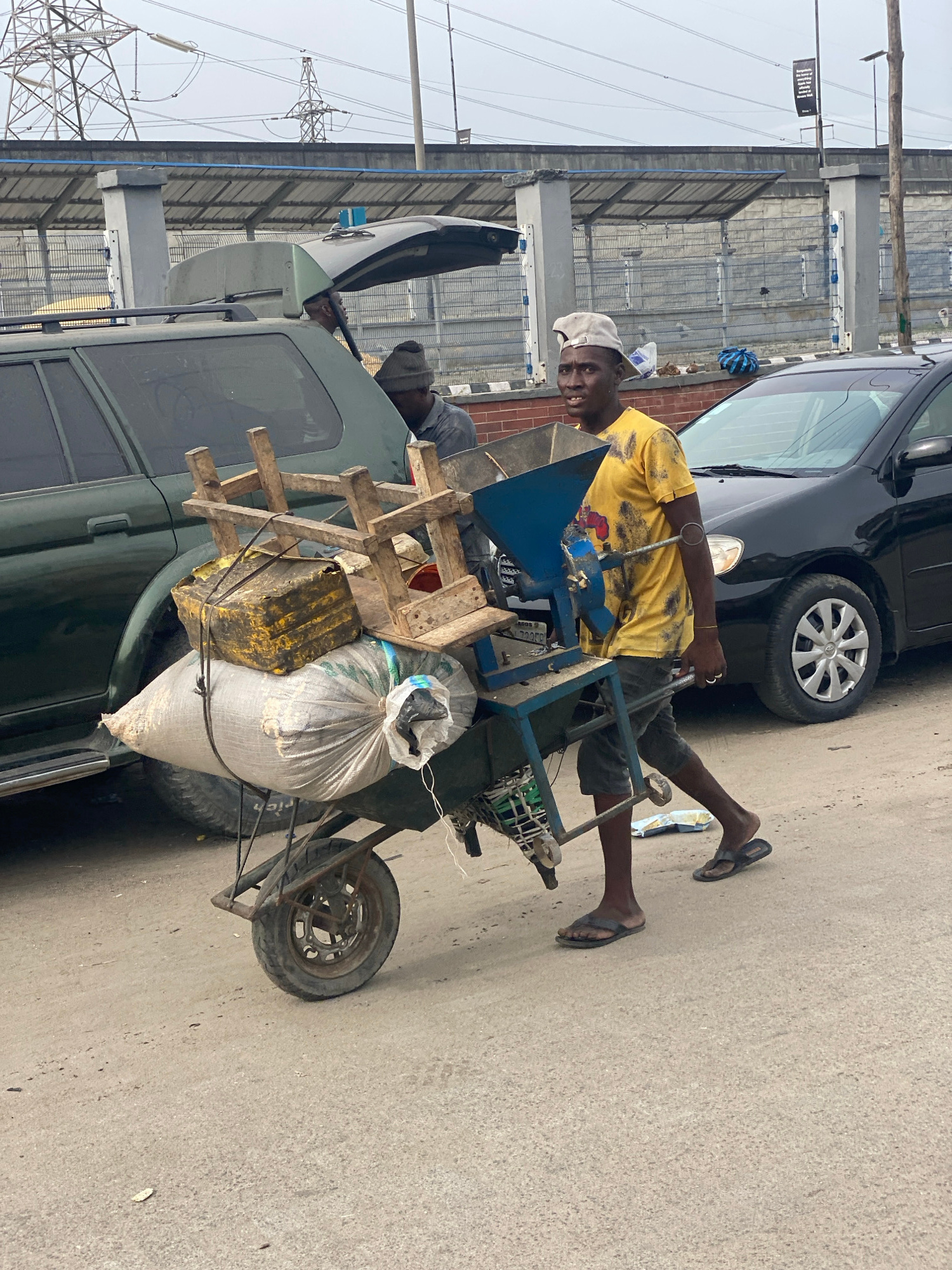A man in a yellow shirt, grey shorts, and a light-colored cap is pushing a heavily laden handcart in Lagos, Nigeria. The cart contains a mix of items, including a metal grinding machine painted blue,…read more