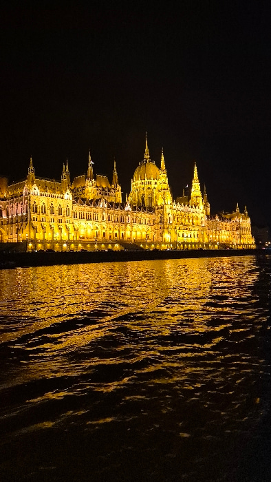 The image displays the Hungarian Parliament Building in Budapest, Hungary, during nighttime. The massive Gothic Revival structure, positioned along the bank of the Danube River, is extensively illumin…read more
