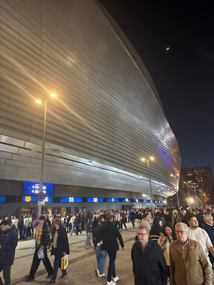The image depicts a nighttime scene outside the Santiago Bernabéu Stadium in Madrid, Spain. A vast, curving, metallic-paneled stadium facade dominates the left and upper portions of the frame, illumin…read more