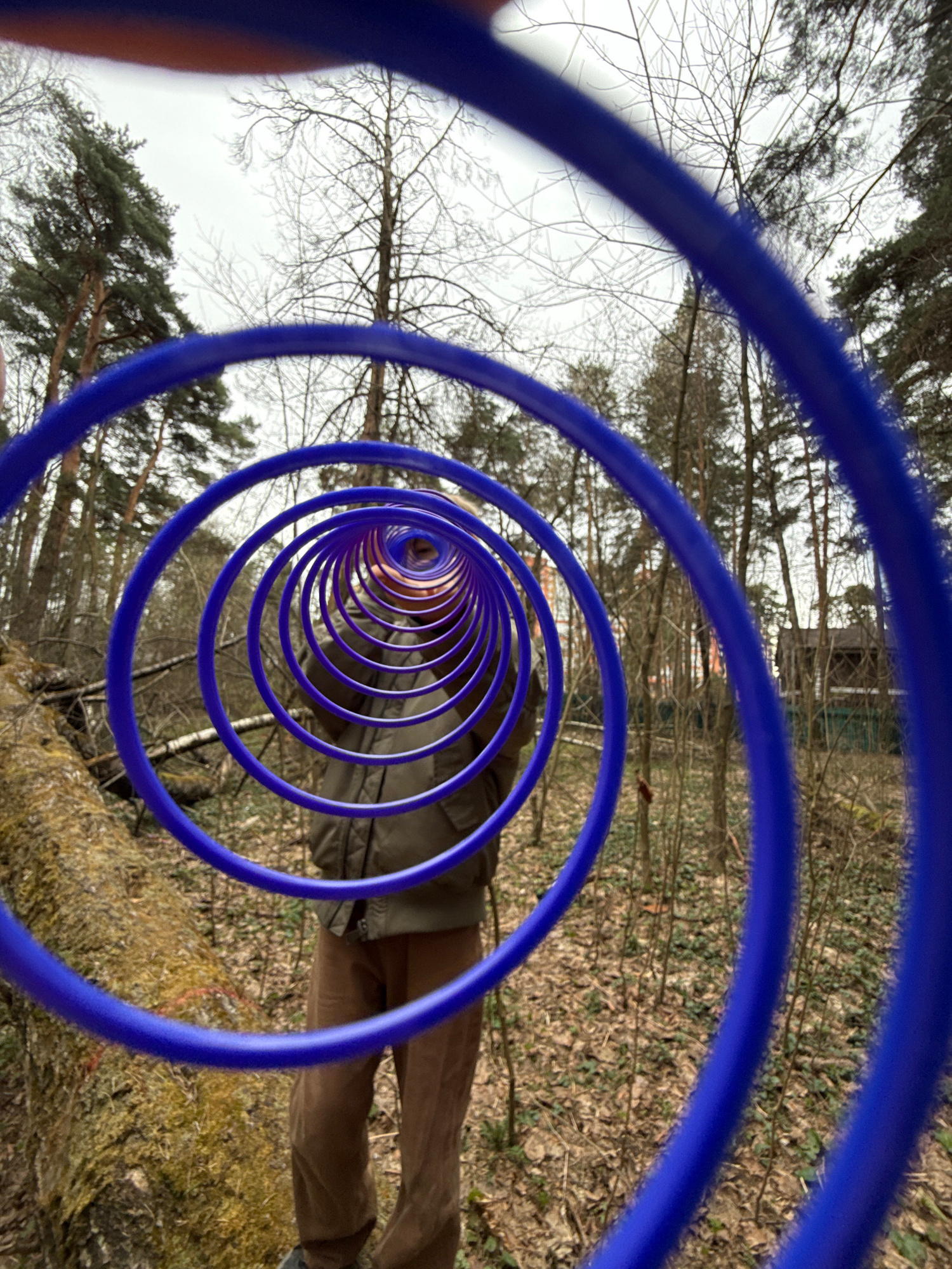 The media file presents a unique, artistically framed outdoor scene in Dmitrov, Russia, viewed through a prominent, flexible, blue spiraled tube or spring. This object creates a tunnel-like, vortex ef…read more