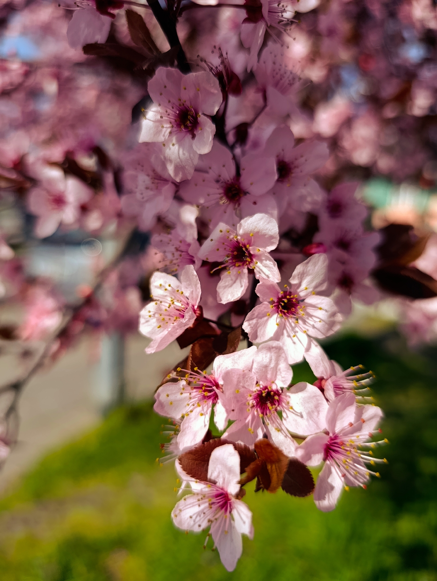 The image shows a close-up of blooming pink flowers, likely from a tree, with a blurred background of green grass and hints of a building or street. The blossoms are clustered together, with visible s…read more