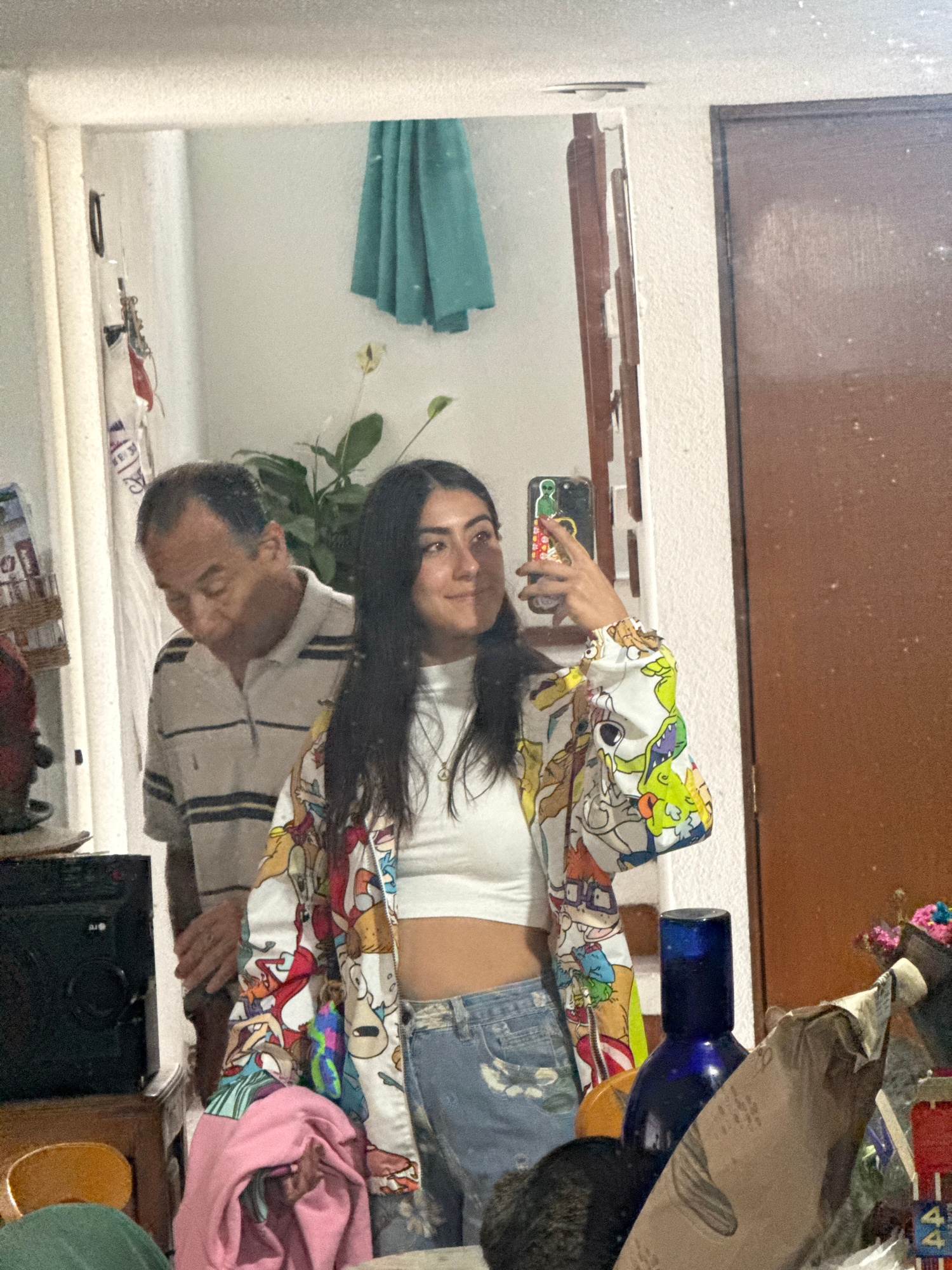 A woman is taking a selfie in a mirror. She is wearing a white top, denim shorts, and a jacket with cartoon characters. Behind her, in the reflection, a man is visible. The reflection suggests the set…read more