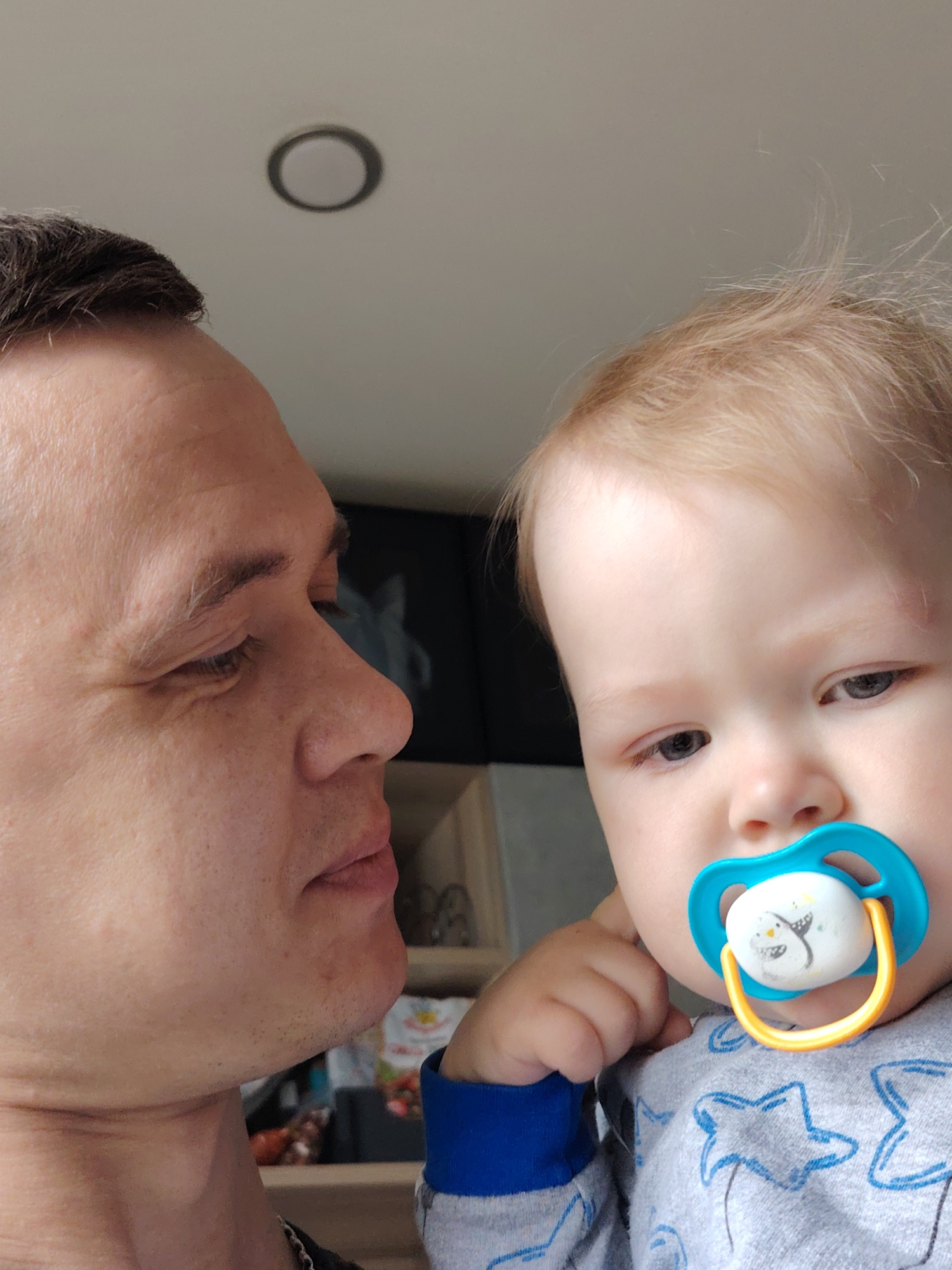 A medium shot captures a fair-skinned man and a baby. The man is on the left, turned slightly to the right, looking at the baby. He has short, dark hair and is wearing a dark shirt. The baby is on the…read more