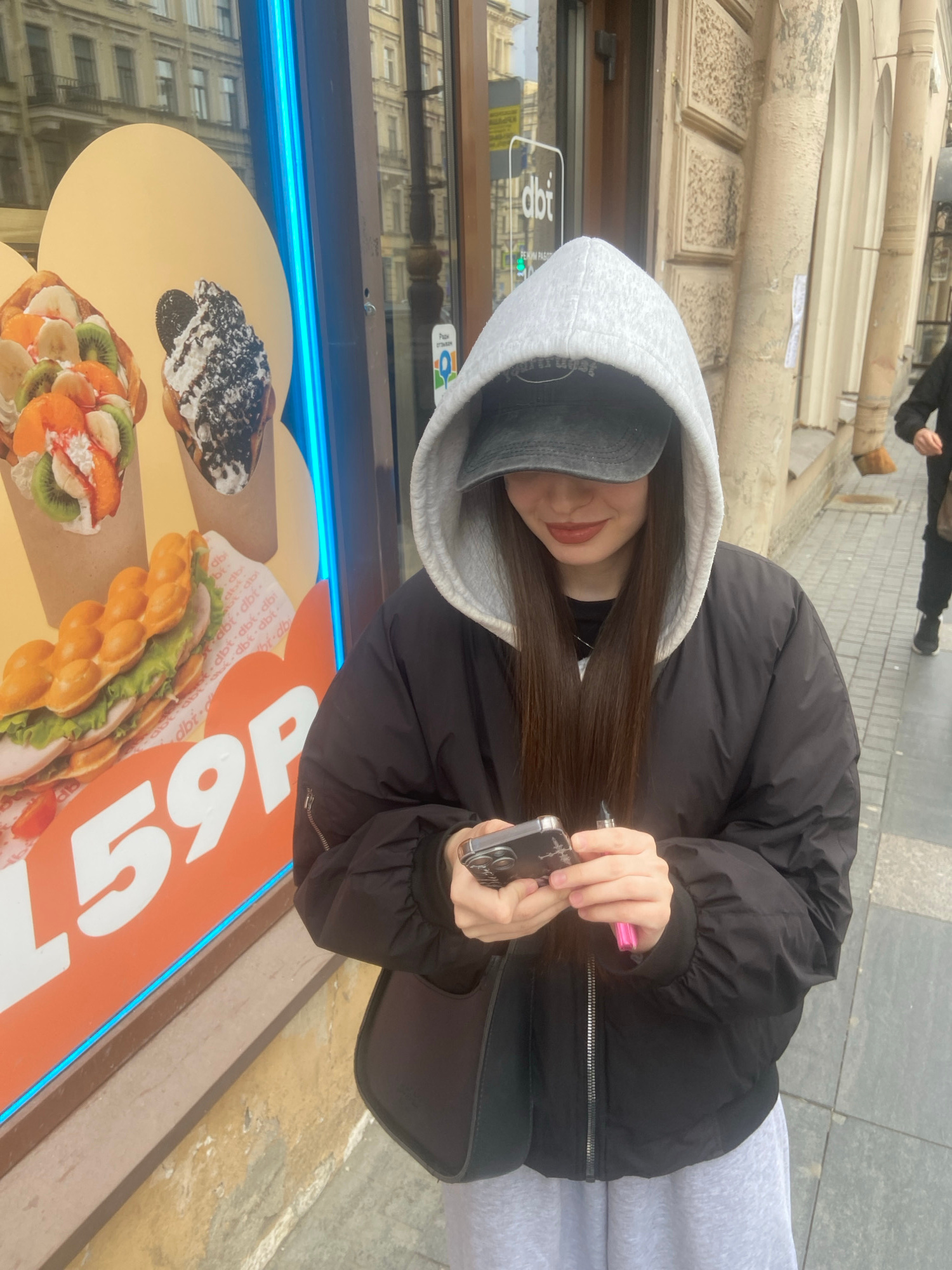 A young woman in a black puffy jacket and gray sweatpants, wearing a gray hooded cap, is taking a photo with her smartphone. She is standing in front of a shop window showcasing images of bubble waffl…read more