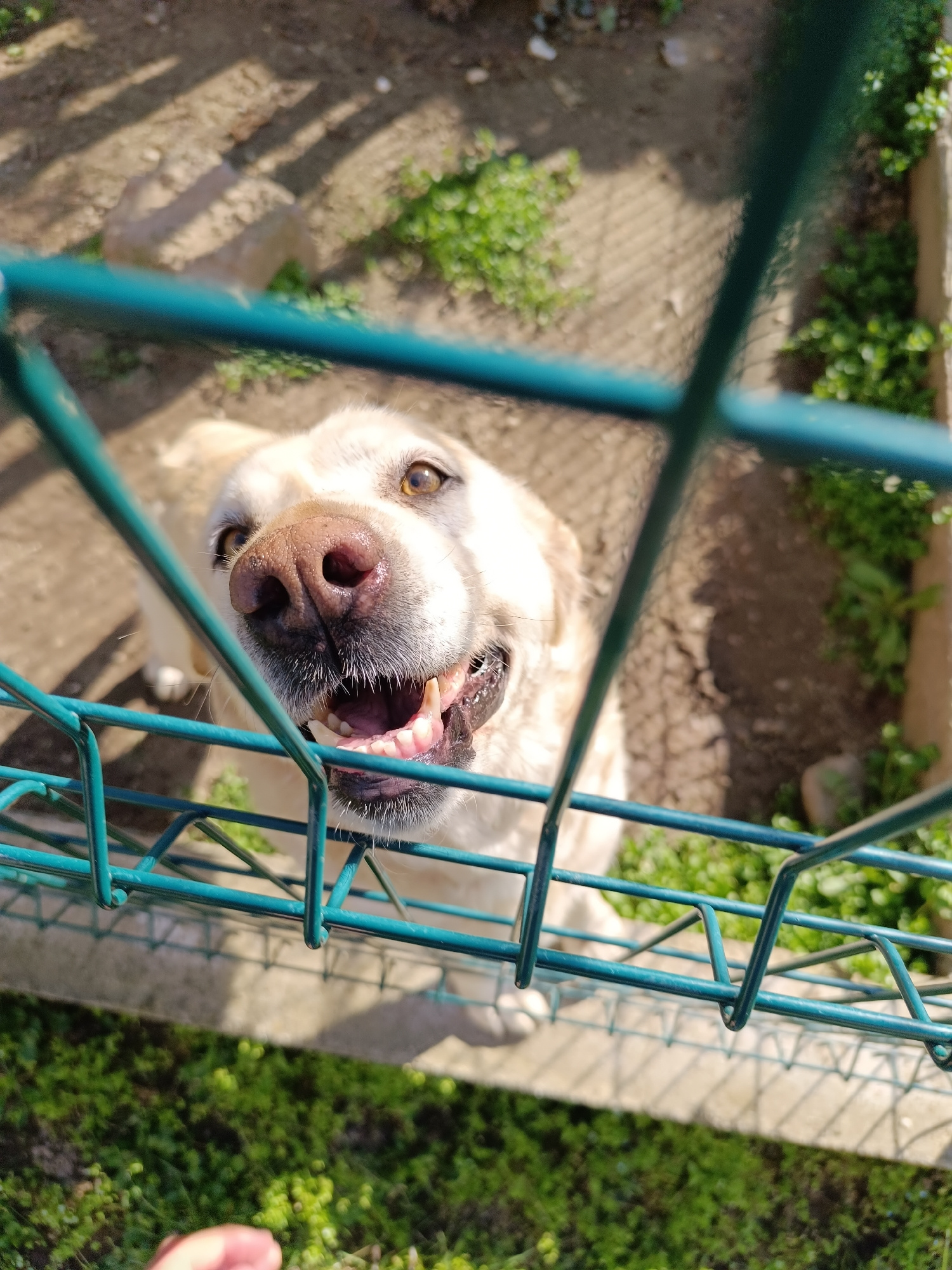 A close-up, eye-level outdoor shot shows a light-colored dog, possibly a Labrador, with its nose and mouth close to a blue-green wire fence. The dog is looking upward with a slightly open mouth, revea…read more