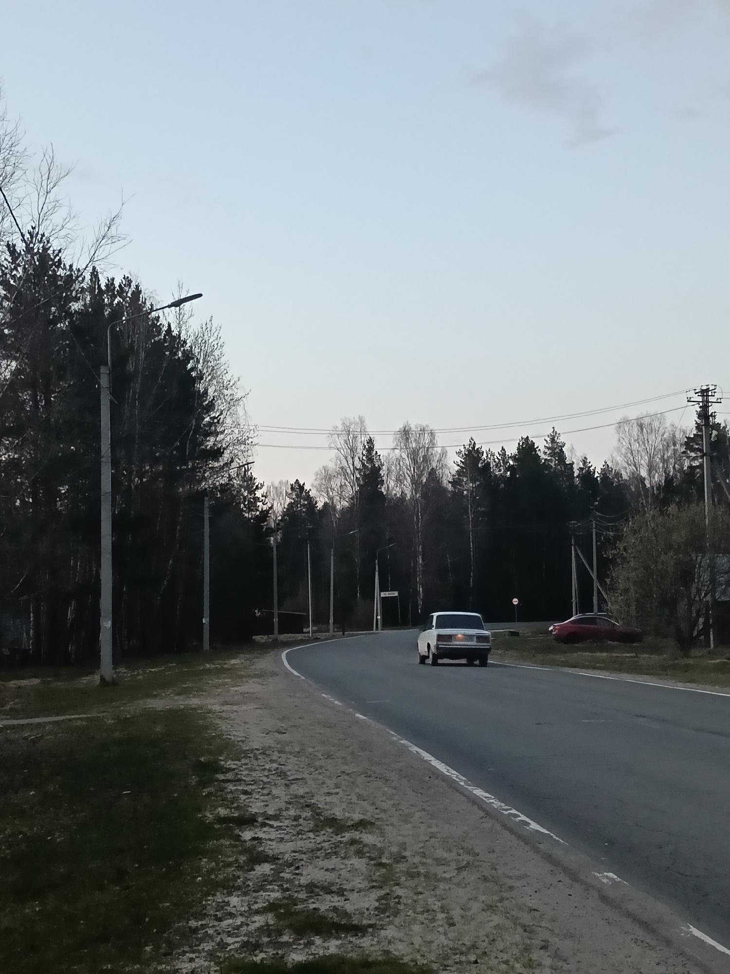 The image captures a rural or semi-rural road scene at dusk or early evening in Красный Маяк, Russia. A two-lane asphalt road curves gently to the right, bordered by a gravel and grass shoulder. On th…read more