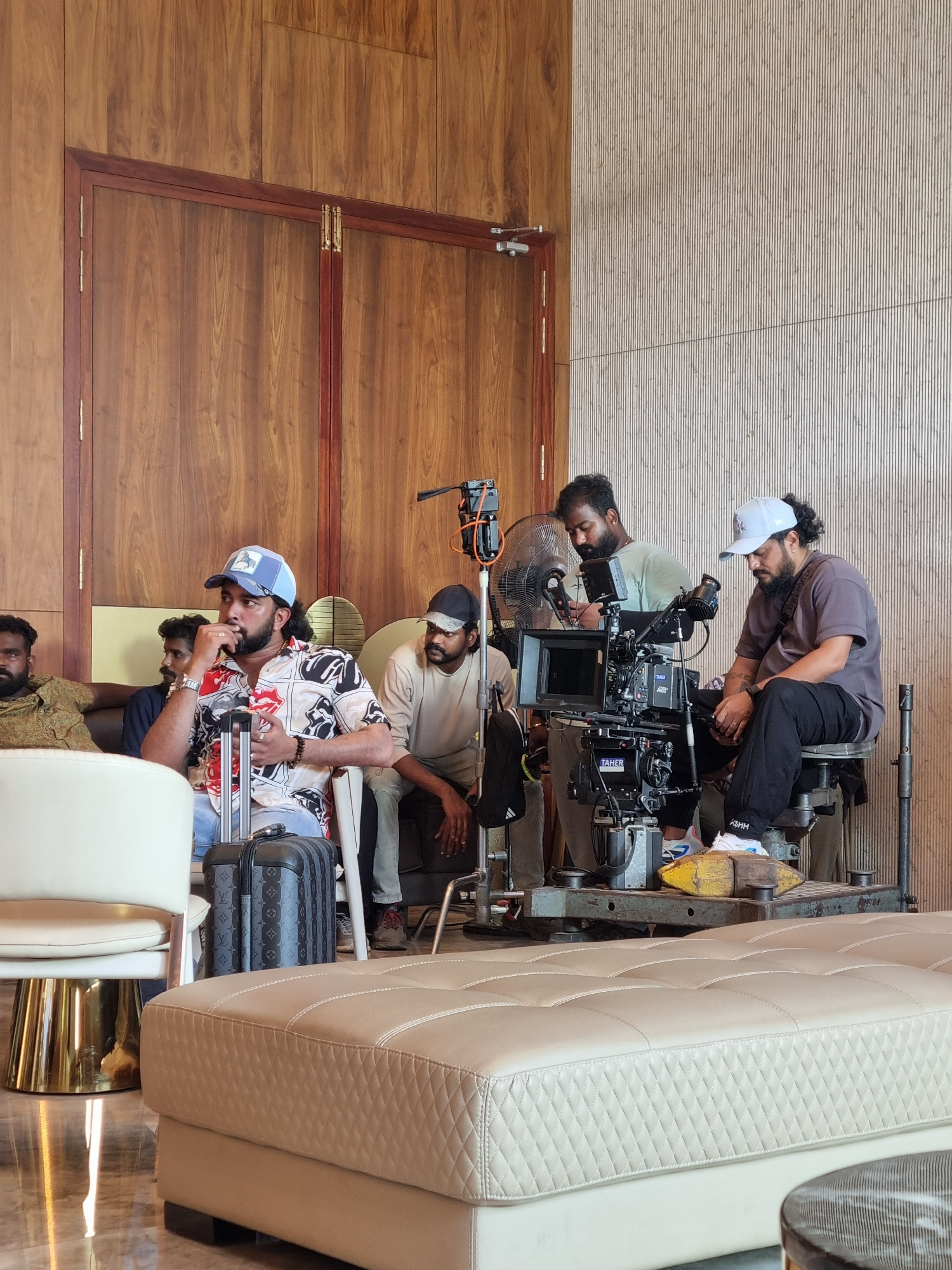 The image shows a scene inside a building in Kottukkara, India. Four men are visible, all appearing to be involved in a film or video shoot. One man in a grey shirt and white cap is leaning over a pro…read more