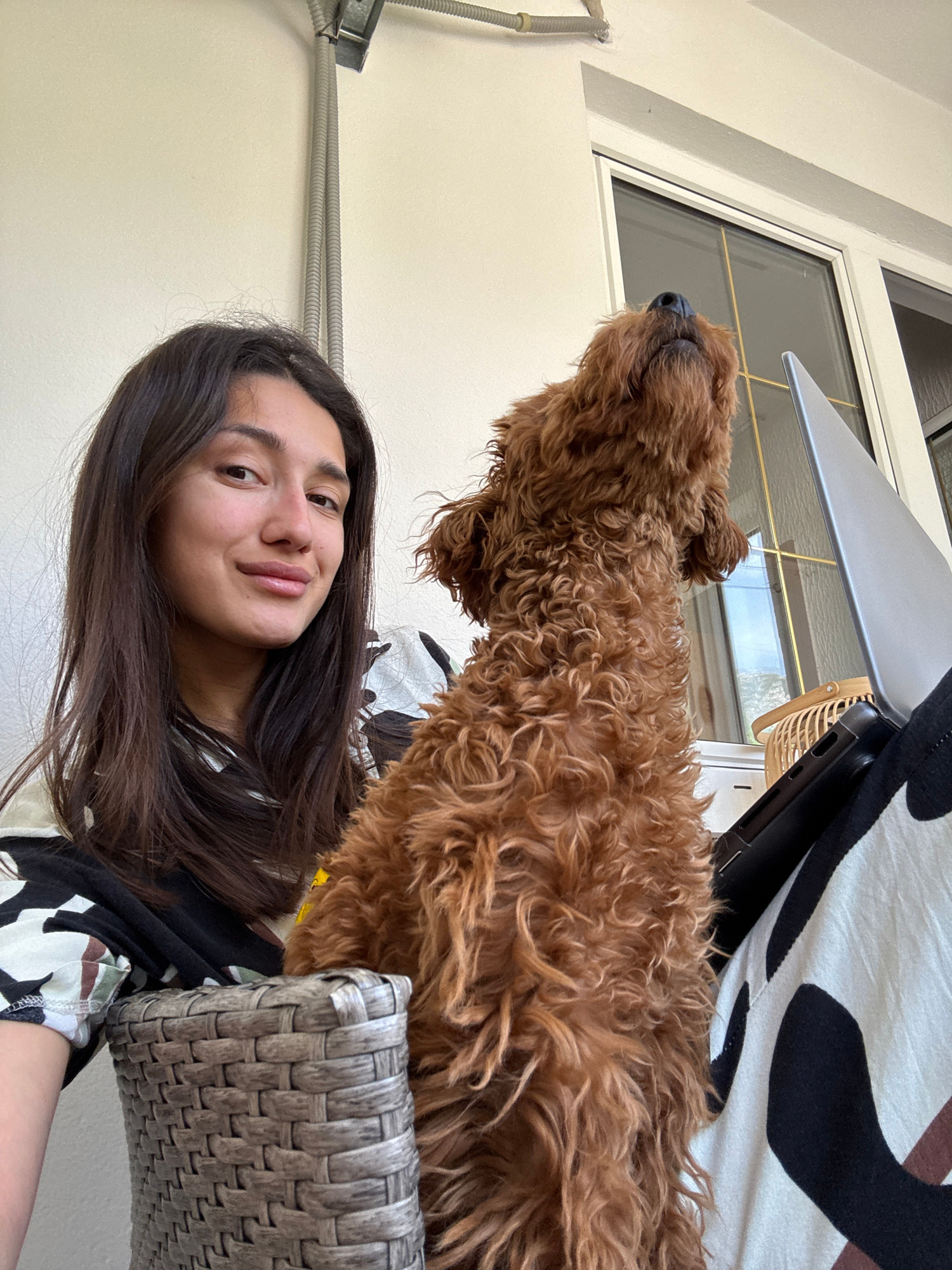 An indoor selfie captures a young woman and a reddish-brown dog, rotated 90 degrees clockwise. The woman, with long, dark brown hair, is in the foreground on the left, smiling subtly at the camera. Sh…read more
