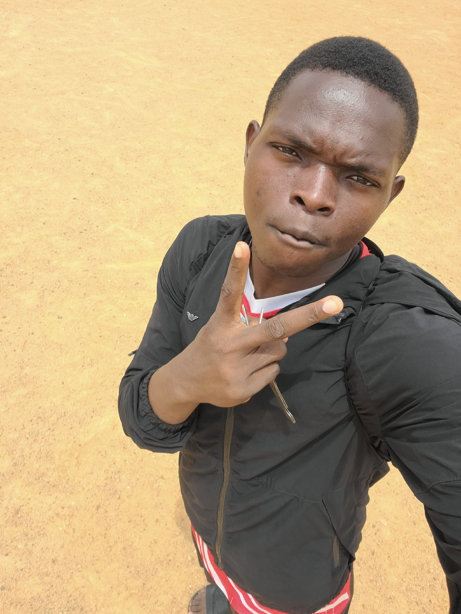A medium-shot, high-angle photograph shows a Black male holding a metal object between the fingers of his left hand. He is wearing a black jacket, a white and red top underneath, and appears to be out…read more
