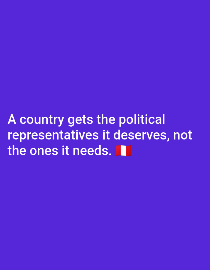 The image consists of white text on a solid purple background. The text reads: "A country gets the political representatives it deserves, not the ones it needs." Following the text is the flag of Per…read more