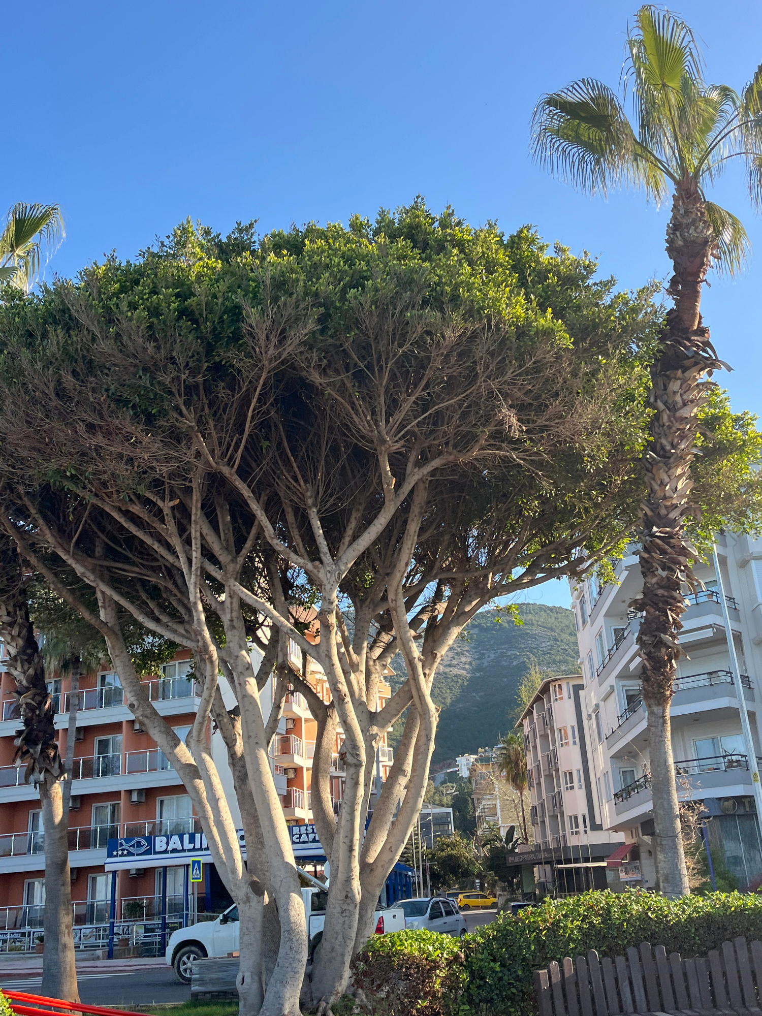 The image depicts a street scene in Alanya, Turkey, with a prominent large tree dominating the foreground. The tree has thick, pale-colored trunks and branches, with dense green foliage at the top. A…read more