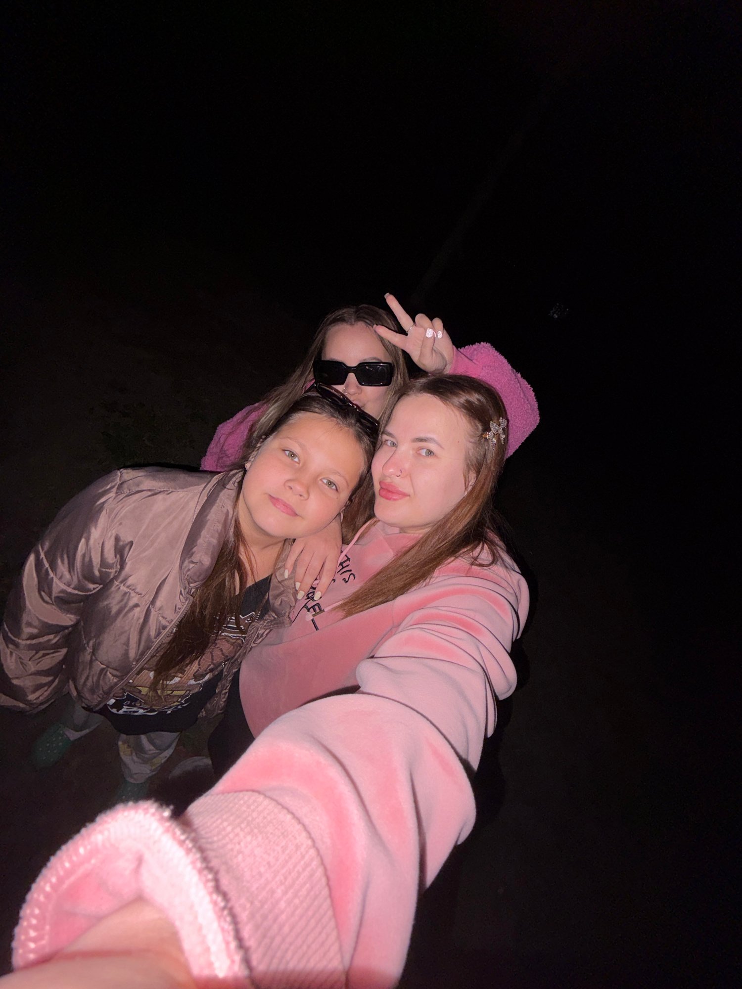 Three females are captured in a selfie-style photograph. The background is dark, possibly nighttime. The subject taking the photo is wearing a pink hooded sweatshirt. Another female in sunglasses make…read more