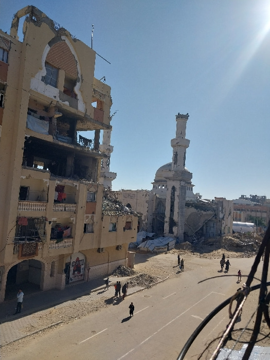 The image depicts a street in Khan Yunis, Palestinian Territory, under a clear, bright blue sky with direct sunlight from the upper right. On the left, a multi-story, light-colored building, likely re…read more