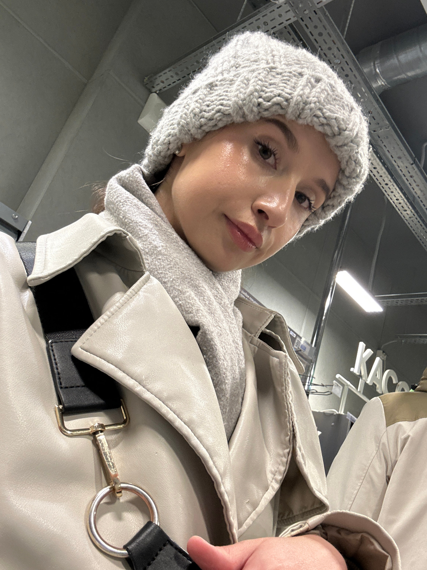 A low-angle, close-up shot captures a young woman looking directly into the camera. She wears a light grey, knitted beanie hat with a textured pattern and a matching light grey scarf or high-collared…read more