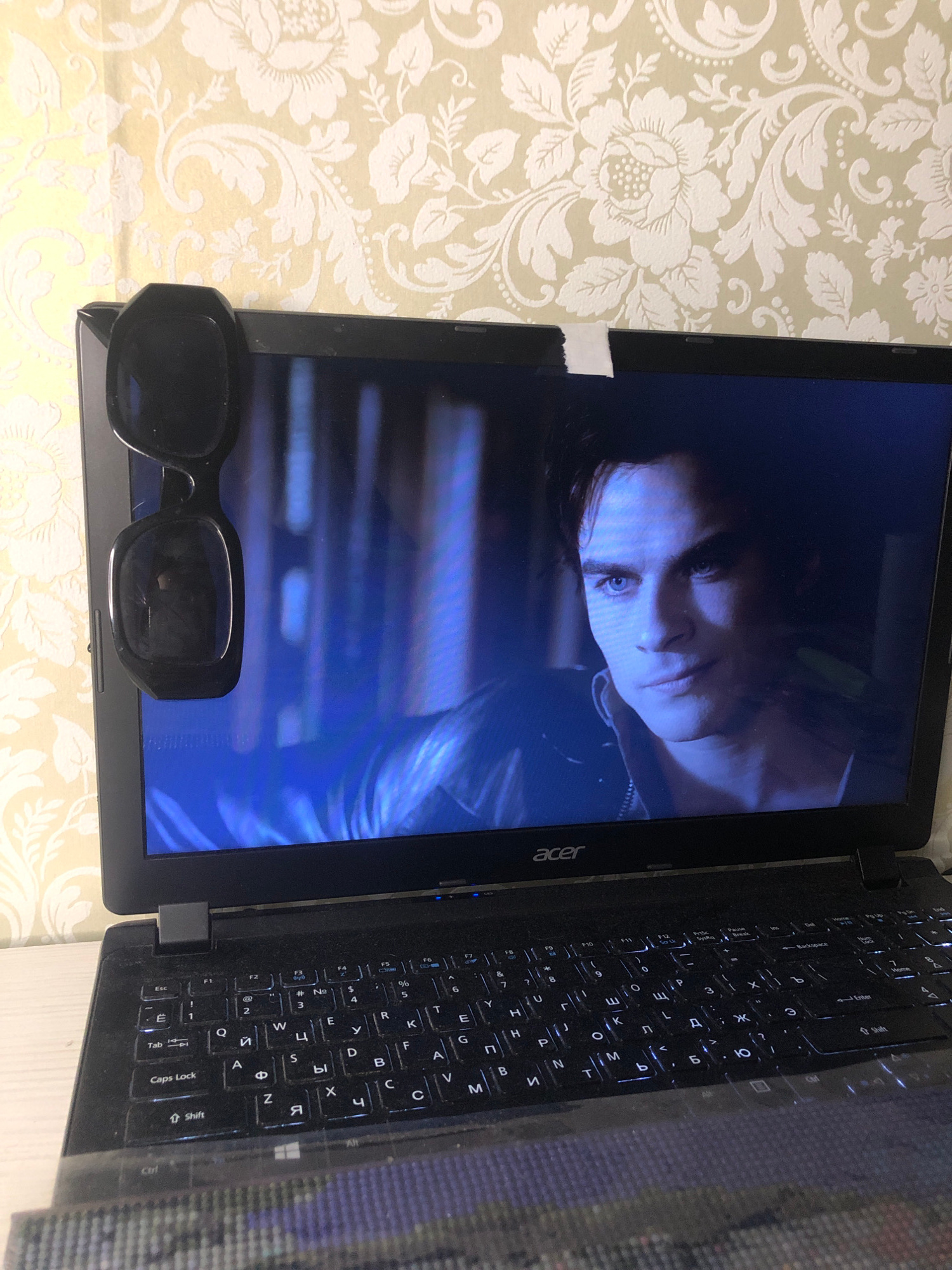 The image shows an open Acer laptop resting on a patterned tablecloth. The laptop screen displays a scene with a person with fair skin and blue eyes, presumably a character from a video or film. A pai…read more