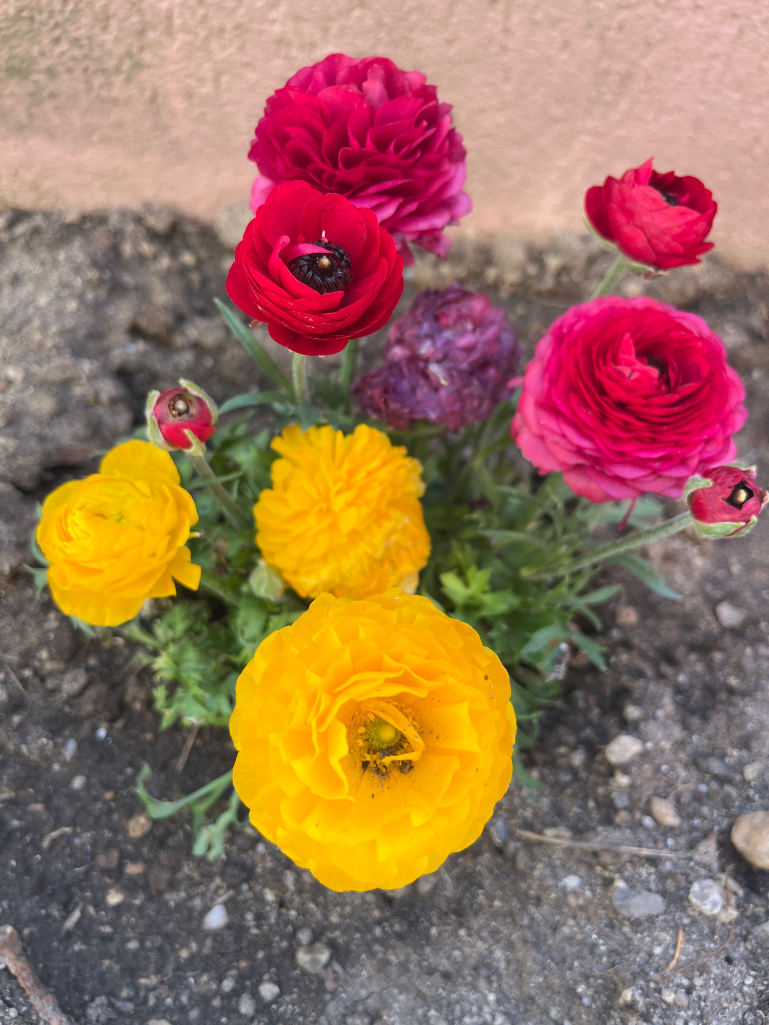 The image shows a close-up, high-angle shot of a cluster of ranunculus flowers in various shades of red, pink, purple, and yellow, growing on a rough, concrete surface. The flowers appear to be recent…read more