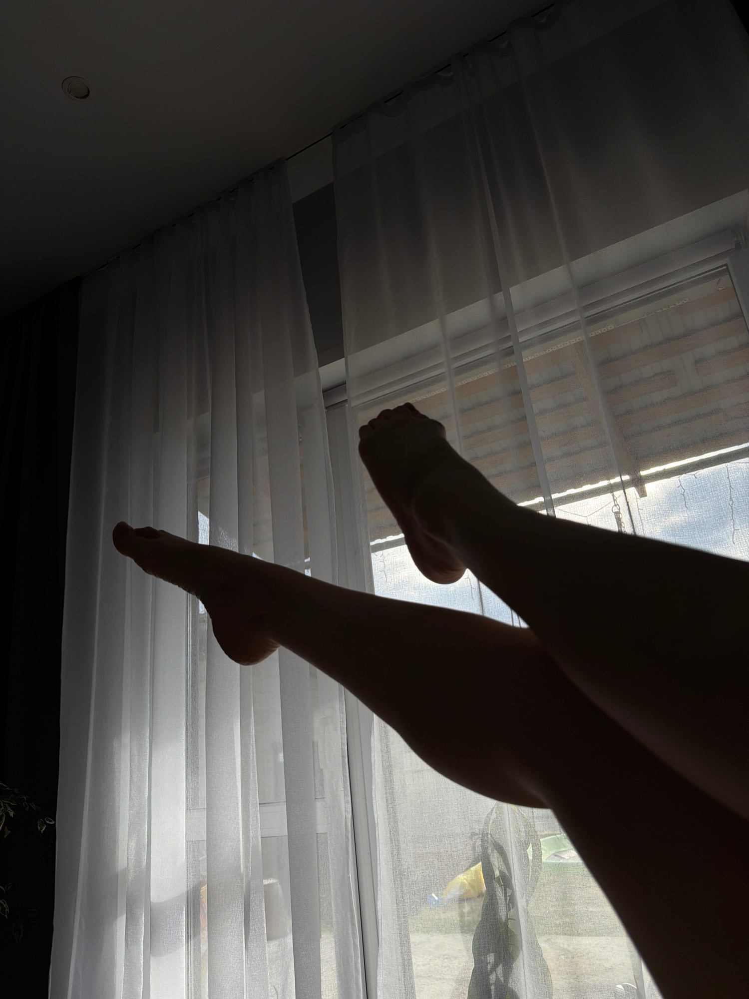 A low-angle shot shows two legs hanging in front of a window covered by white blinds. The image appears to have been taken indoors, potentially at a residence. The legs are in silhouette, making detaiβ¦read more