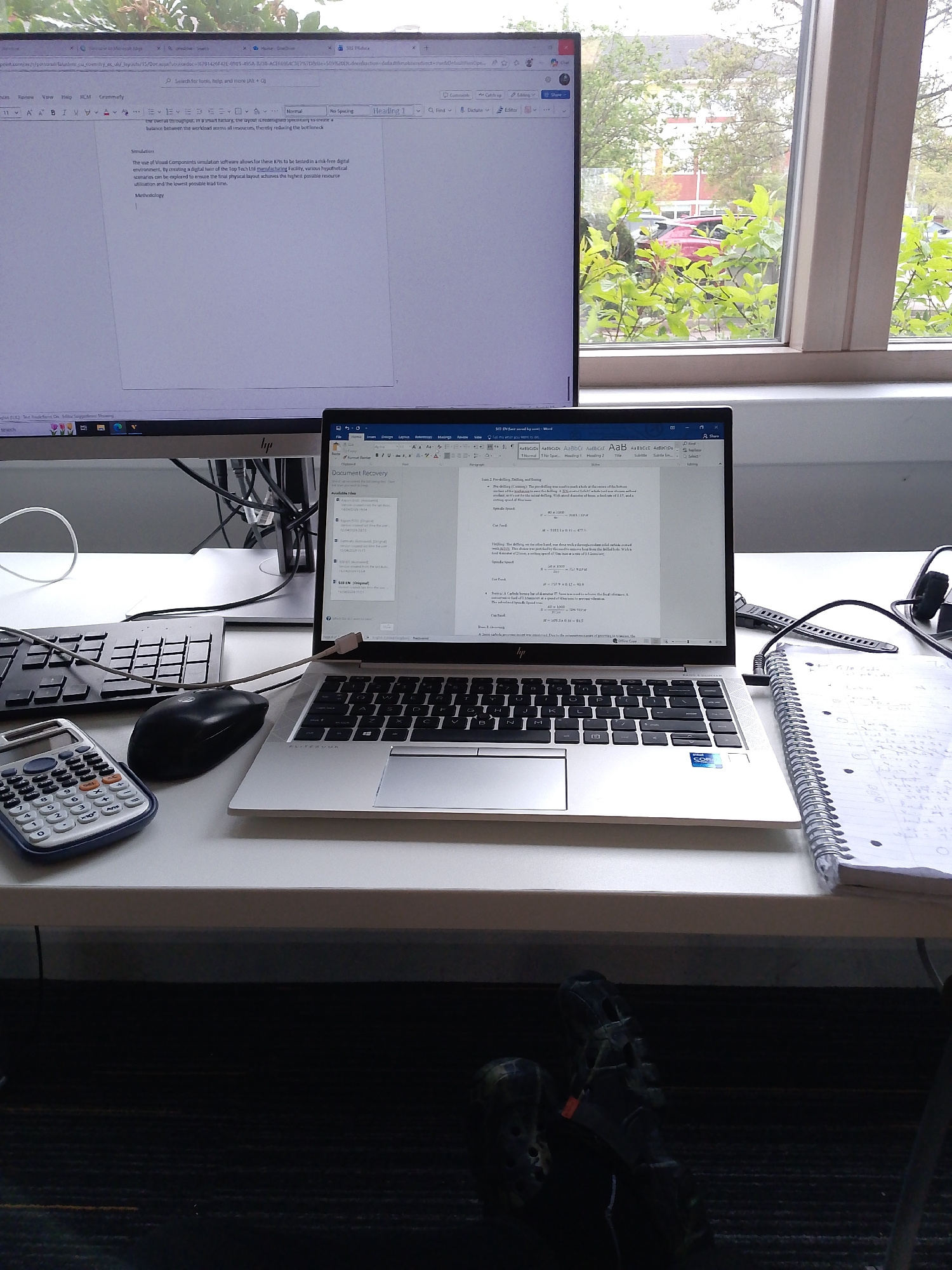 The image captures a first-person perspective of a workspace, likely an office or study area, featuring a desk with a dual-monitor setup next to a window. The feet of a person wearing dark shoes are v…read more