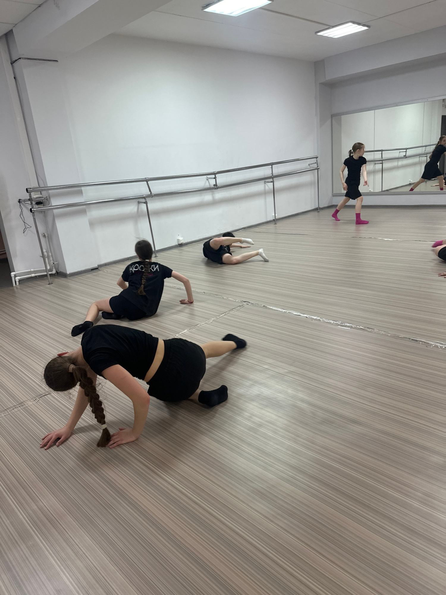 The image shows a dance studio in Votkinsk, Russia. Five individuals are present, engaged in stretching exercises on a light wood-grain floor. The studio has white walls, a ballet barre, and a mirrore…read more