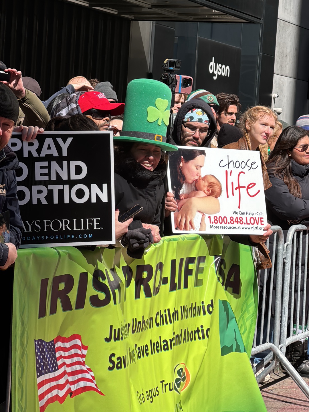 The image depicts an outdoor daytime gathering, likely a protest or demonstration, on a city street in New York City, United States. A commercial building with a "dyson" logo is visible in the backgro…read more