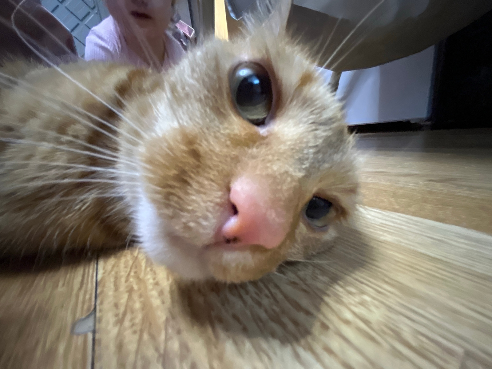 A close-up, upside-down view of an orange cat's face is the main subject. The cat has a pink nose and prominent whiskers. The background includes a light-colored wood surface, possibly a table or floo…read more