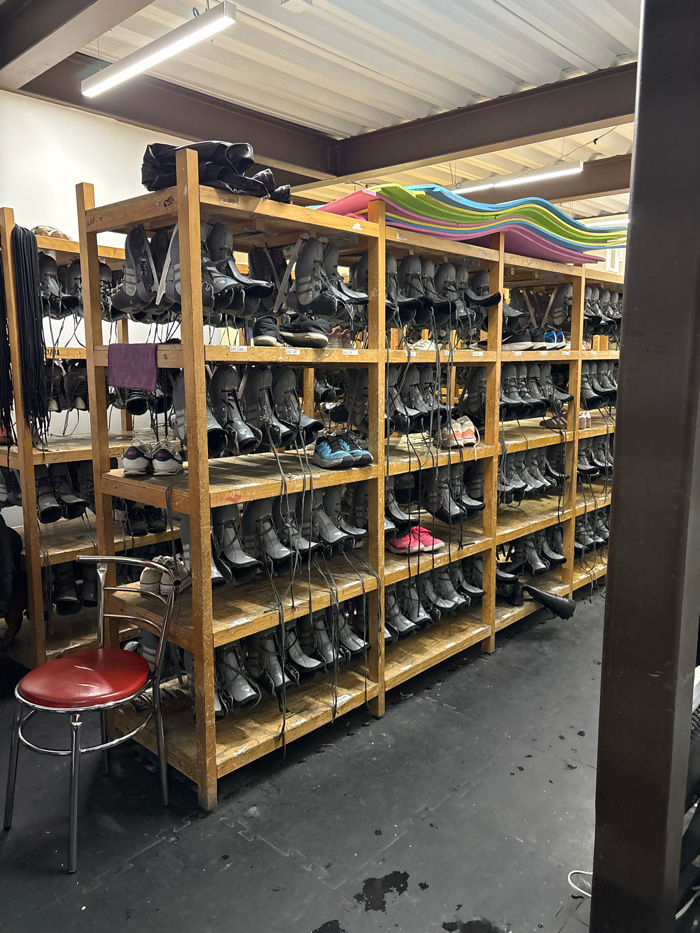 This image captures an indoor storage area, identified as being located in Huixquilucan de Degollado, Mexico, likely associated with a recreational facility. The scene is dominated by five multi-tiere…read more