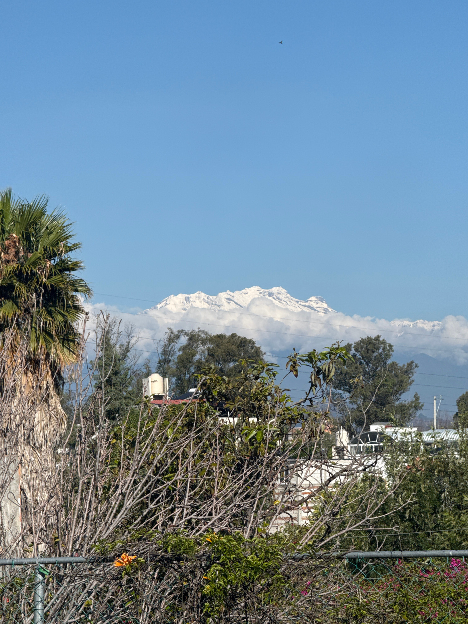 A daytime shot of a mountainous landscape in what appears to be San Bernardino Tlaxcalancingo, Mexico, is taken from a slightly elevated position, possibly a residential area. The sky is clear and blu…read more