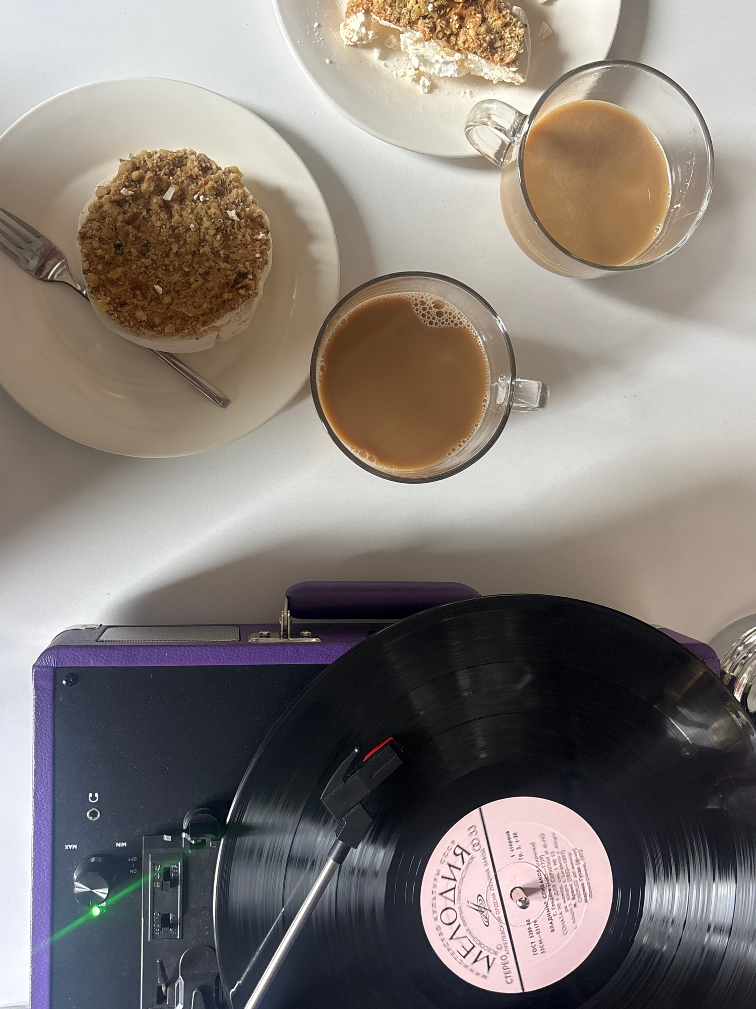 On a white surface, a record player with a black vinyl record labeled "Melodiya" is positioned next to two cups of coffee and two plates with pastries. A fork rests on one of the plates. The record pl…read more