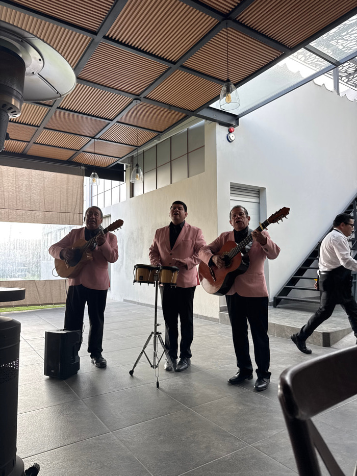 Three musicians in pink blazers and black pants perform indoors. Two play guitars, and one plays drums. A fourth person in a white shirt and black pants is visible in the background. The setting inclu…read more