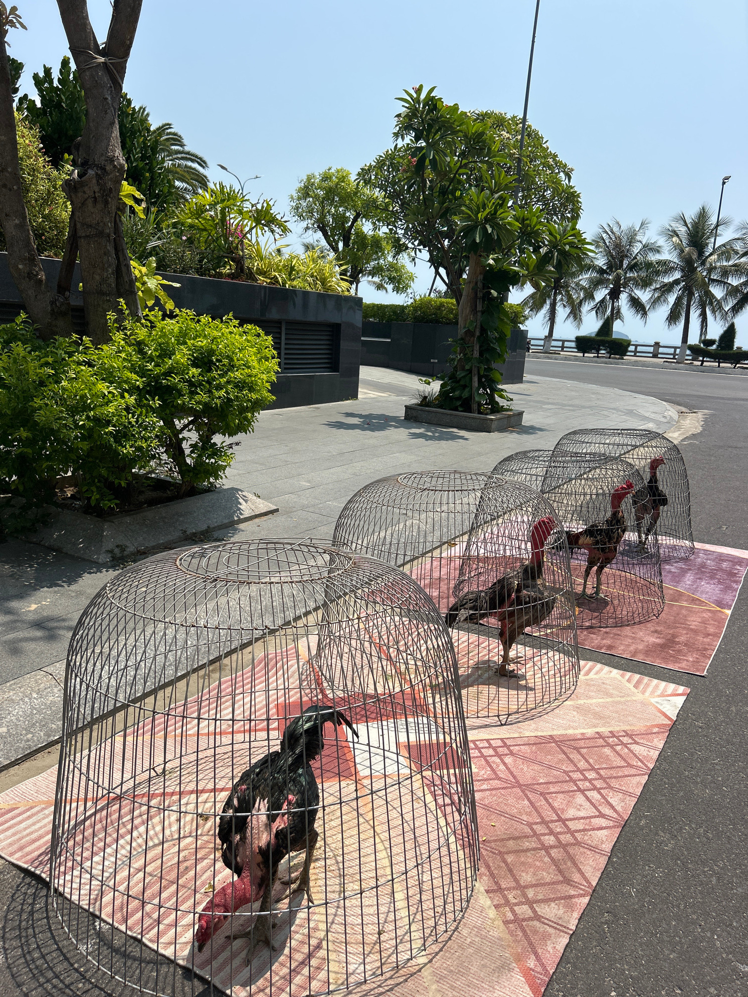 The image shows four fighting cocks in wire cages along a paved street in Bắc Nha Trang, Vietnam. The roosters are standing on patterned mats under the cages. Vegetation, including palm trees, shrubs,…read more