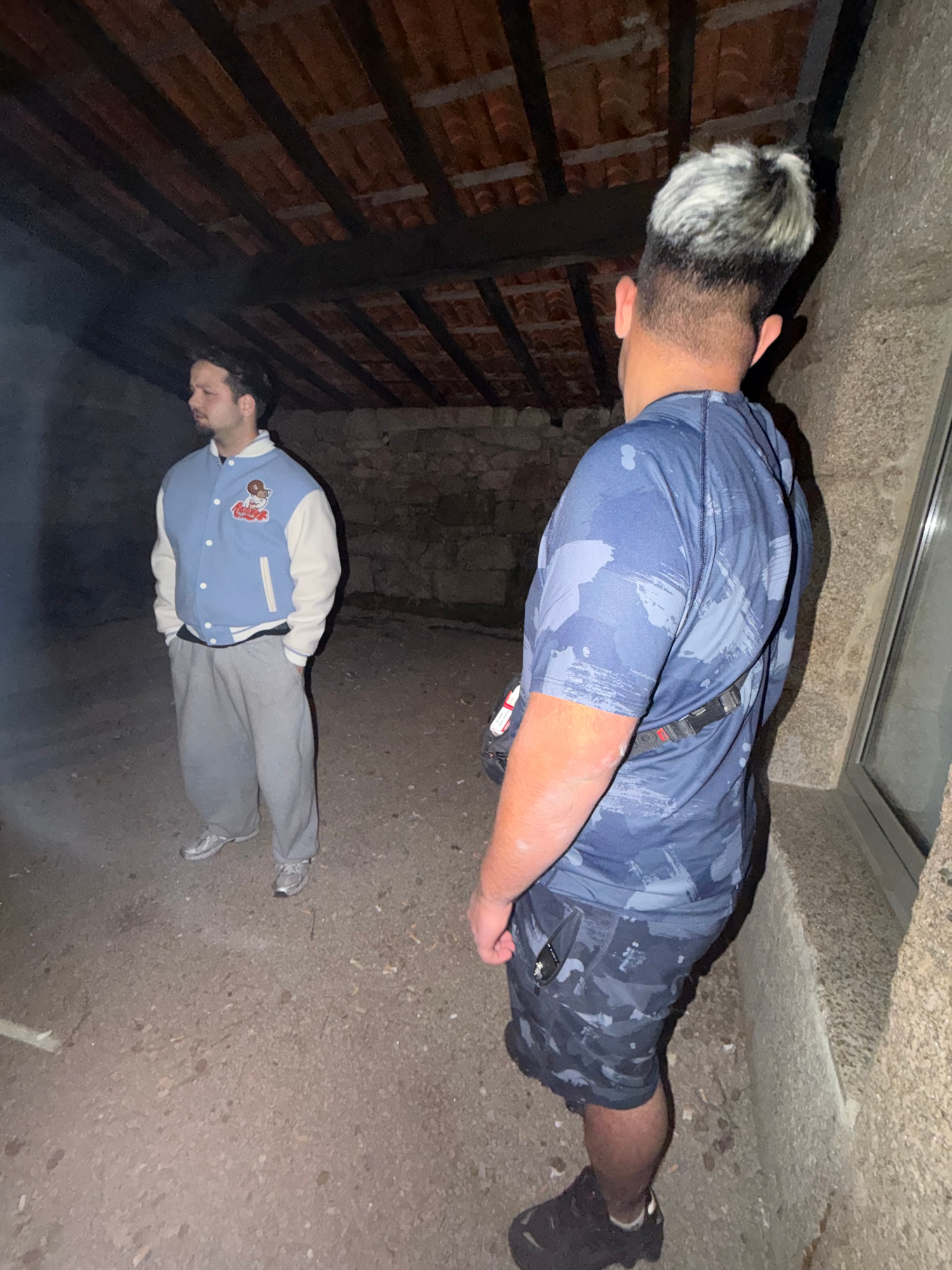 Two men stand in an outdoor location at night. The man on the top wears a blue t-shirt and shorts with dark shoes. The man on the bottom wears a blue and white jacket with gray pants and silver shoes.…read more