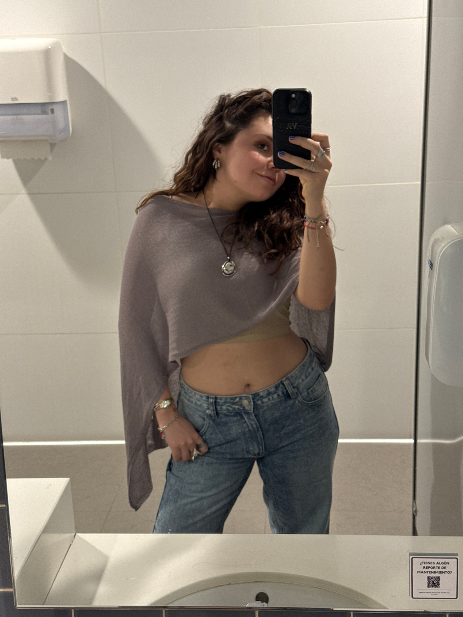 A woman is taking a selfie in a bathroom mirror. She is wearing a light purple top, blue jeans, a necklace, and multiple rings and bracelets. Her midriff is exposed. The bathroom has white tiled walls…read more