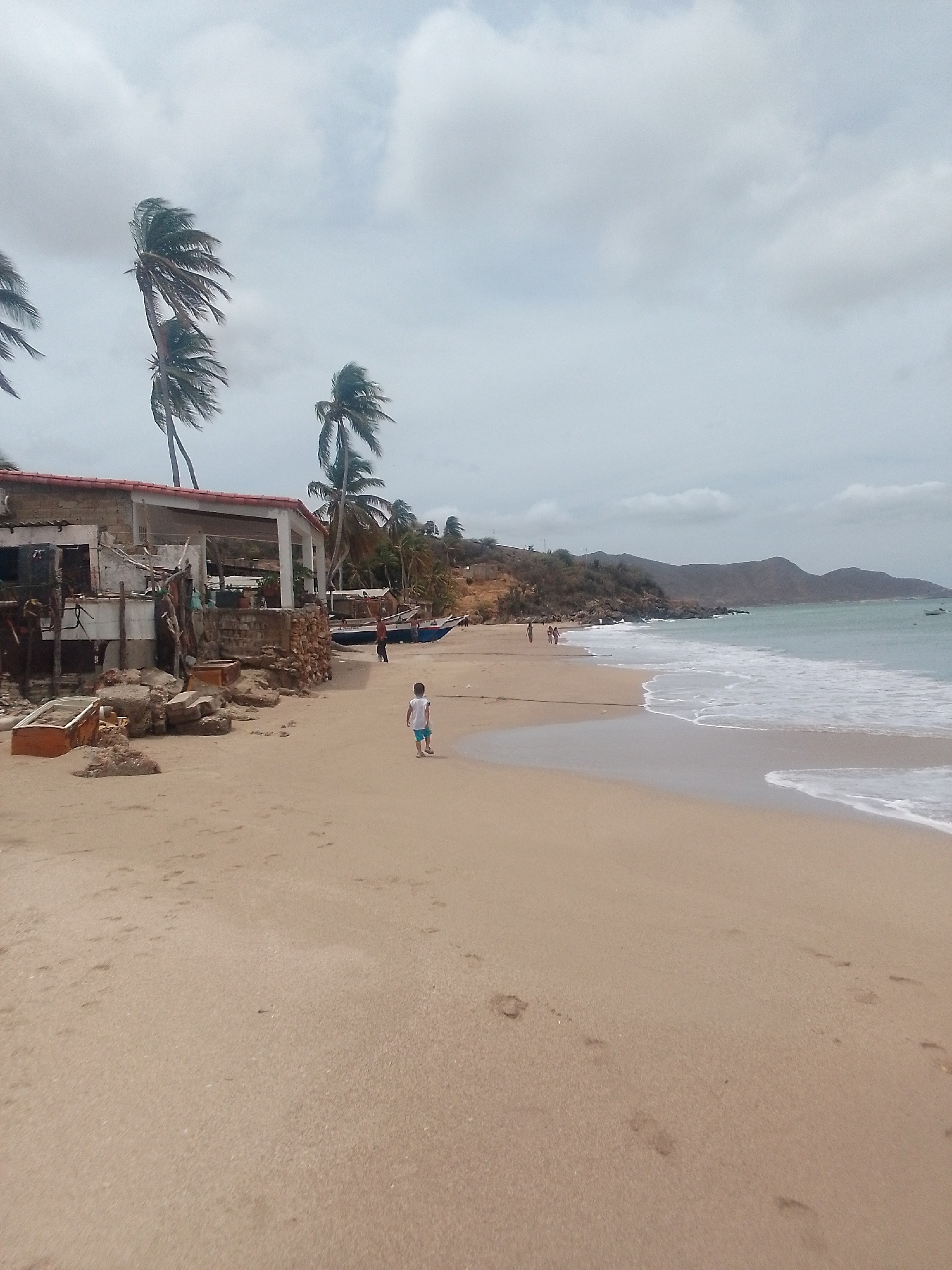 The image depicts a beach in Juan Griego, Venezuela, on a cloudy day. The sand is light brown, and the ocean waves are visible at the water's edge. A young boy is walking along the beach toward the wa…read more