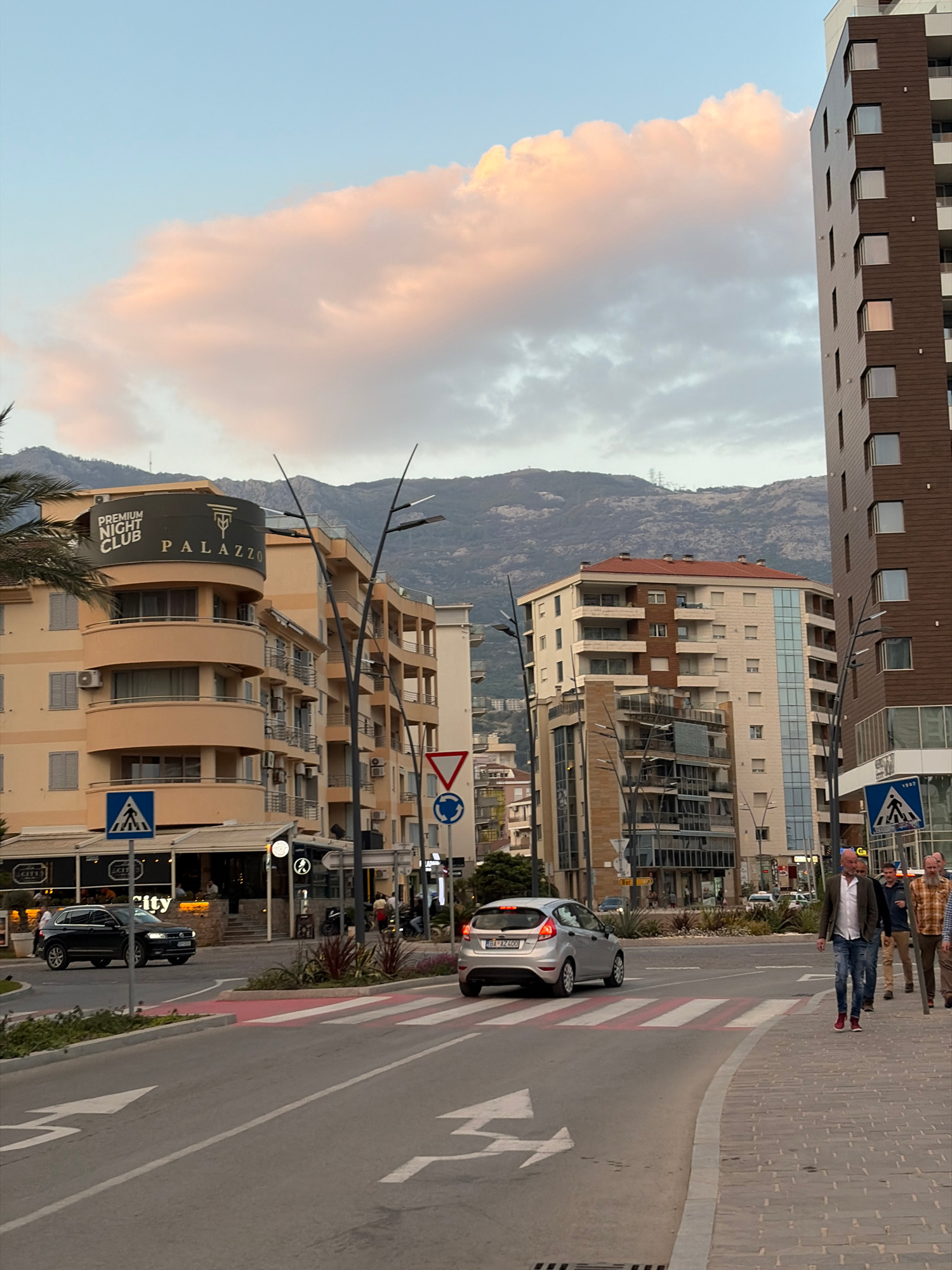 The image depicts a street scene in Budva, Montenegro, with a building identified as "Palazzo Premium Night Club" visible in the foreground. A mountain range serves as a backdrop. A silver car is posi…read more