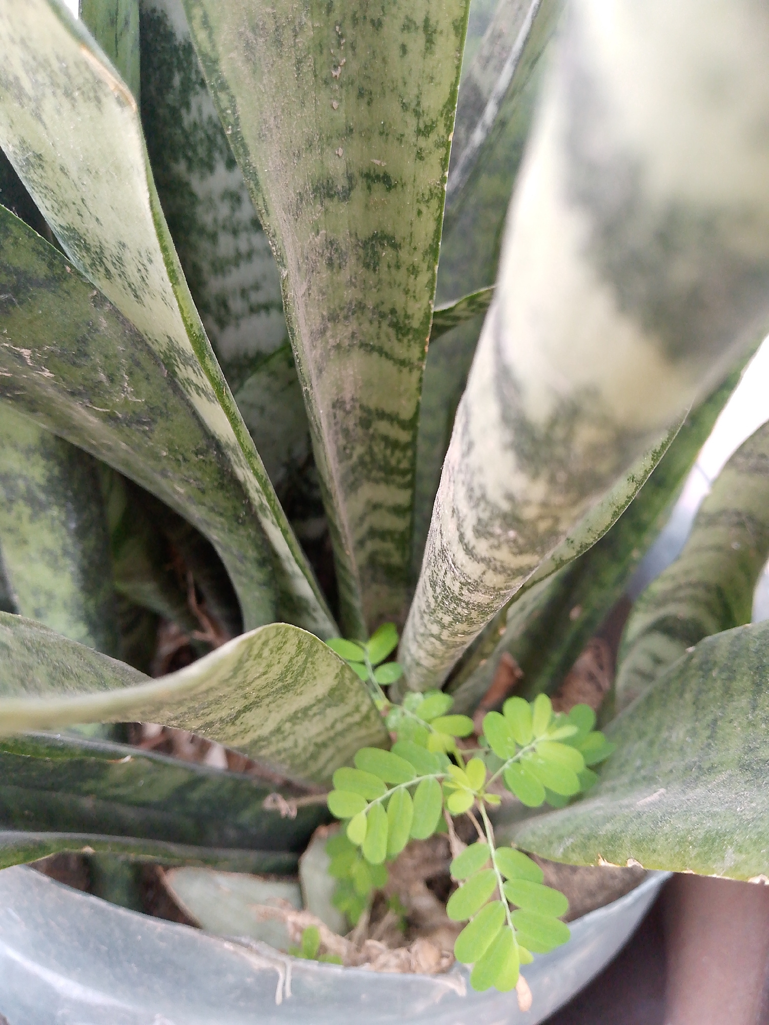 A close-up shot of a potted snake plant (Sansevieria trifasciata). A small, leafy weed is growing in the pot, next to the snake plant. The pot is gray, and the background is blurred, suggesting an out…read more
