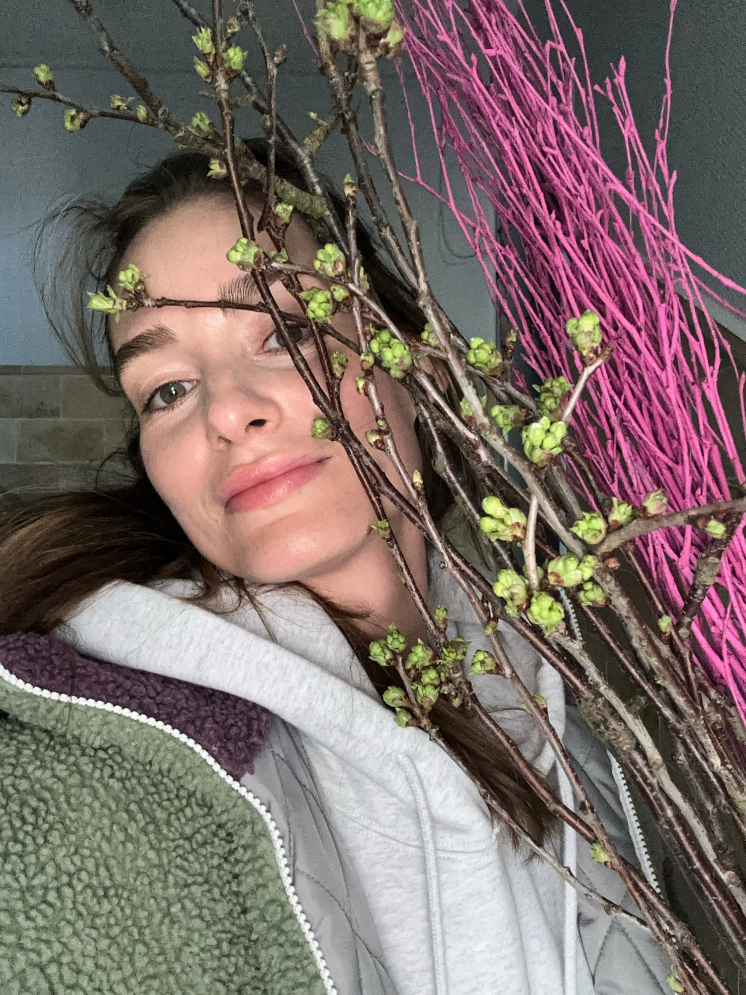 A person with long brown hair is partially obscured by branches with sprouting green buds and pink-painted branches. The person has fair skin, light eyebrows, and green eyes. They are wearing a light…read more