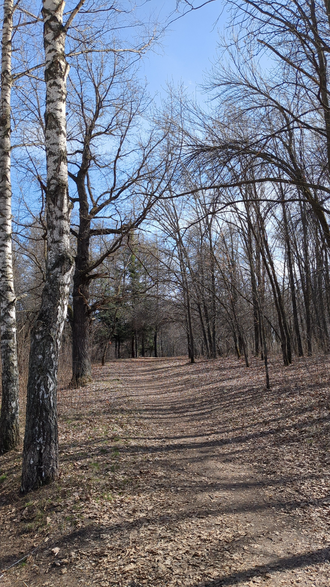 This image depicts a serene forest or wooded park scene, characteristic of late winter or early spring in a location like Ulyanovsk, Russia. The sky is a vibrant, cloudless blue, indicating clear and…read more