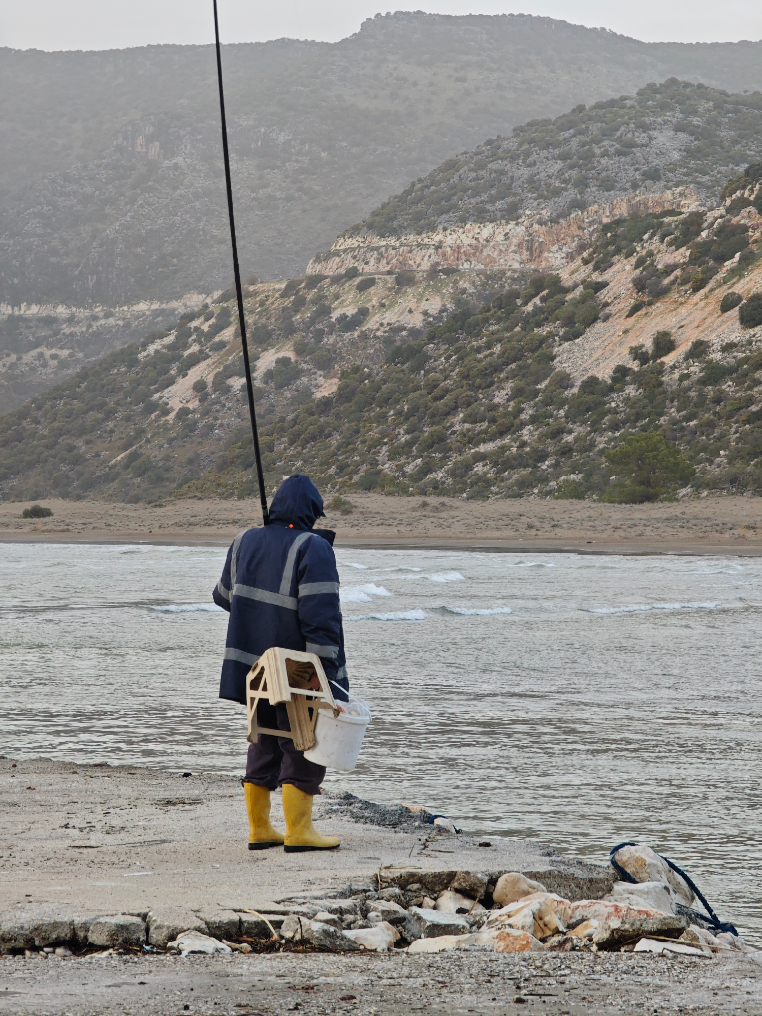 A fisherman stands on a concrete pier on a cloudy day in Demre, Turkey. He faces the sea, holding a fishing rod, a bucket, and a small stool. He wears a dark blue raincoat, dark pants, and yellow boot…read more