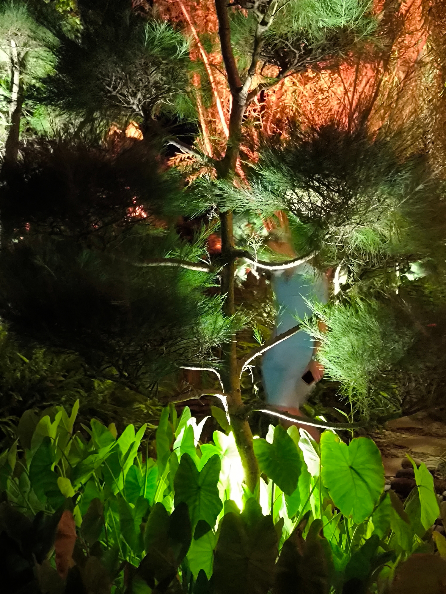 The image depicts an outdoor garden scene at night in Kediri, Indonesia, dramatically illuminated by artificial lights. In the foreground, a dense cluster of large-leafed plants, possibly taro, glows…read more