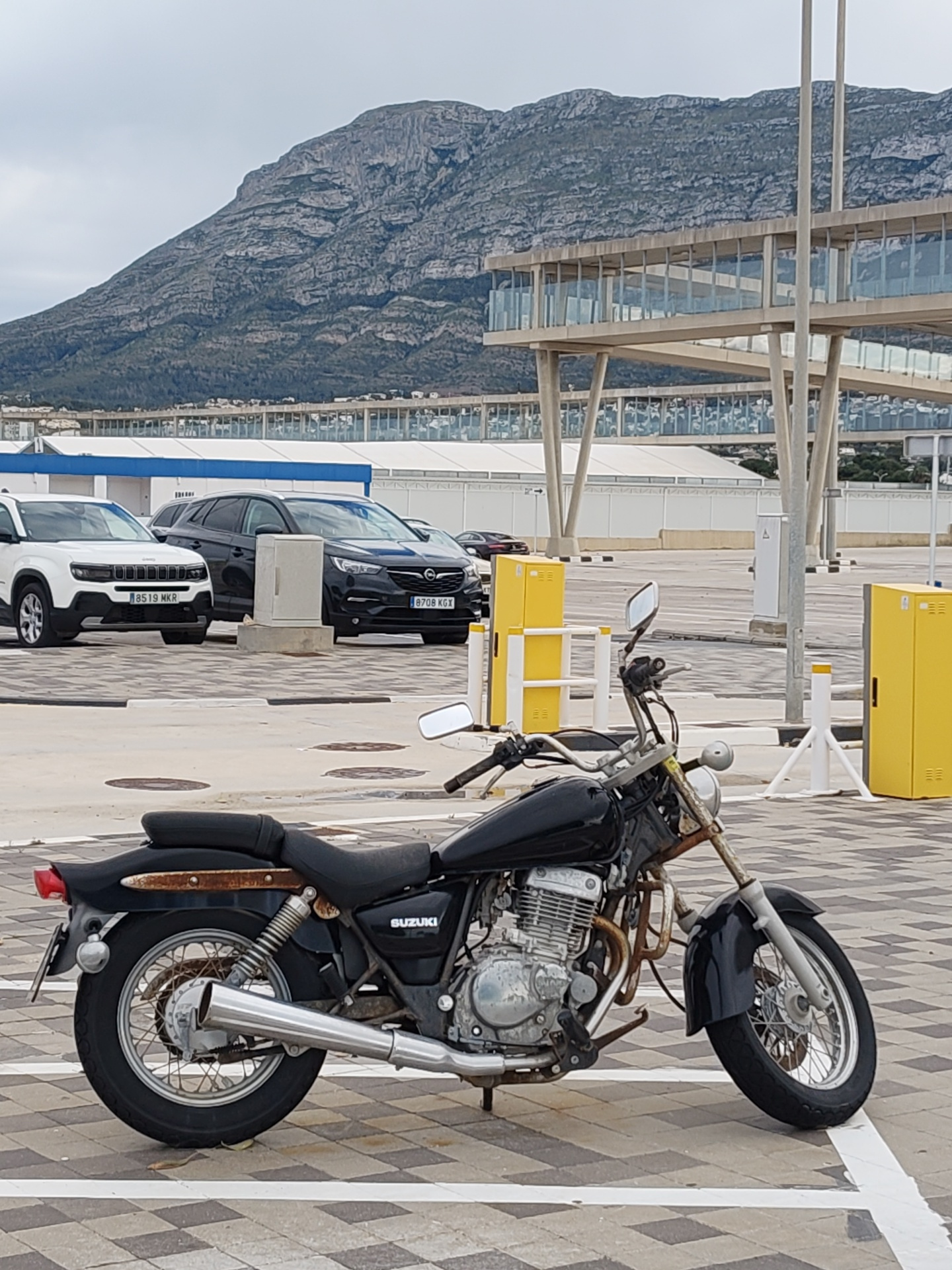 The image is taken in what appears to be a parking area. A black Suzuki motorcycle is prominently positioned in the foreground. In the background, there are several parked cars including a white Jeep…read more