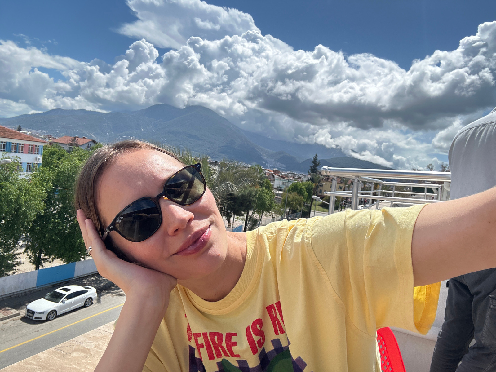 A woman with light skin and short hair poses for a selfie, wearing sunglasses and a yellow t-shirt with a colorful design. She is resting her head on her hand, and a ring is visible on her finger. Beh…read more