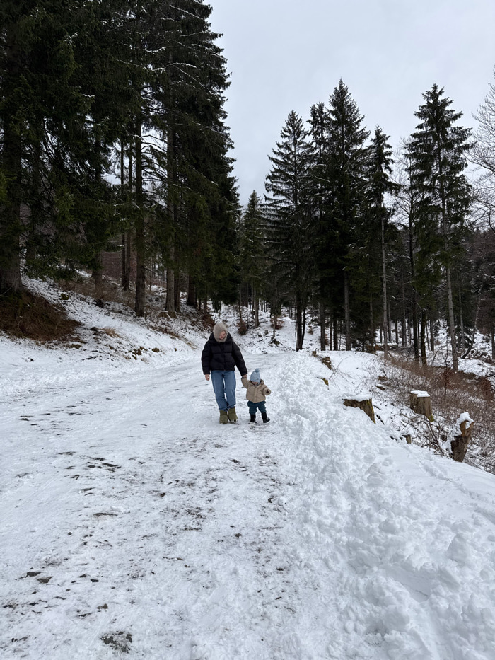 A winter landscape shows a snow-covered path winding through tall evergreen trees. A person dressed in a black coat, jeans, and boots holds the hand of a child also warmly dressed. Snow is piled high…read more