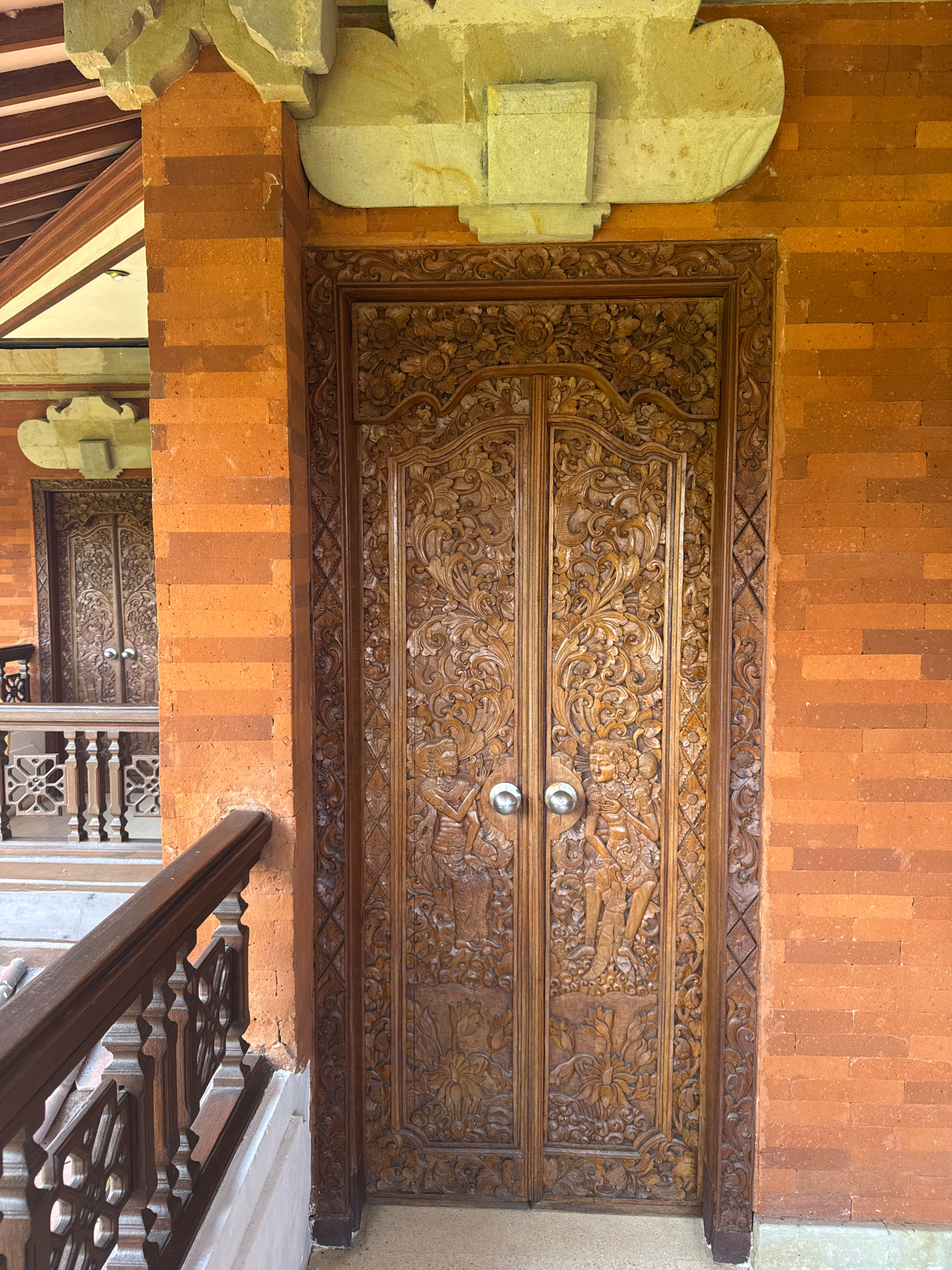 A close-up, eye-level shot shows the underside of a wooden structure with intricate carvings, located in an unknown city in Indonesia. The structure appears to be part of the ceiling or roof, featurin…read more