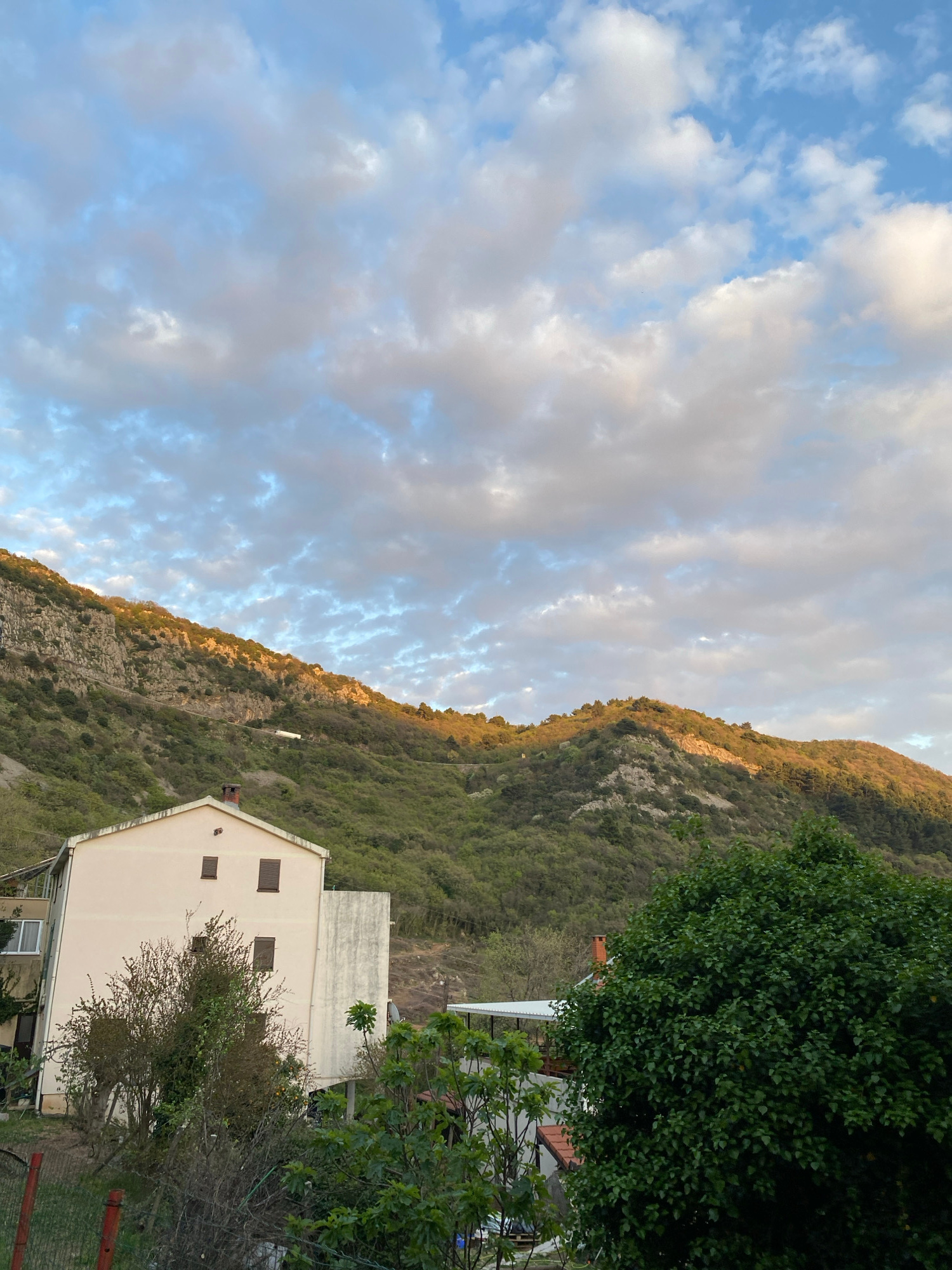 The image shows a view in Budva, Montenegro. A large, tan-colored building with dark shutters is situated at the base of a mountain covered with green vegetation. The building has a pitched roof and a…read more