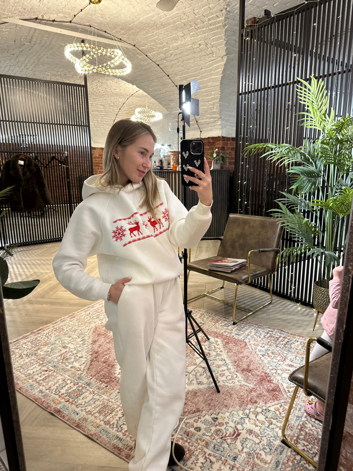 A blonde woman in a white reindeer-themed sweatsuit takes a mirror selfie. Her phone is held up to the upper right. The reflection captures a room with a vaulted ceiling, modern lighting, and a metal-…read more