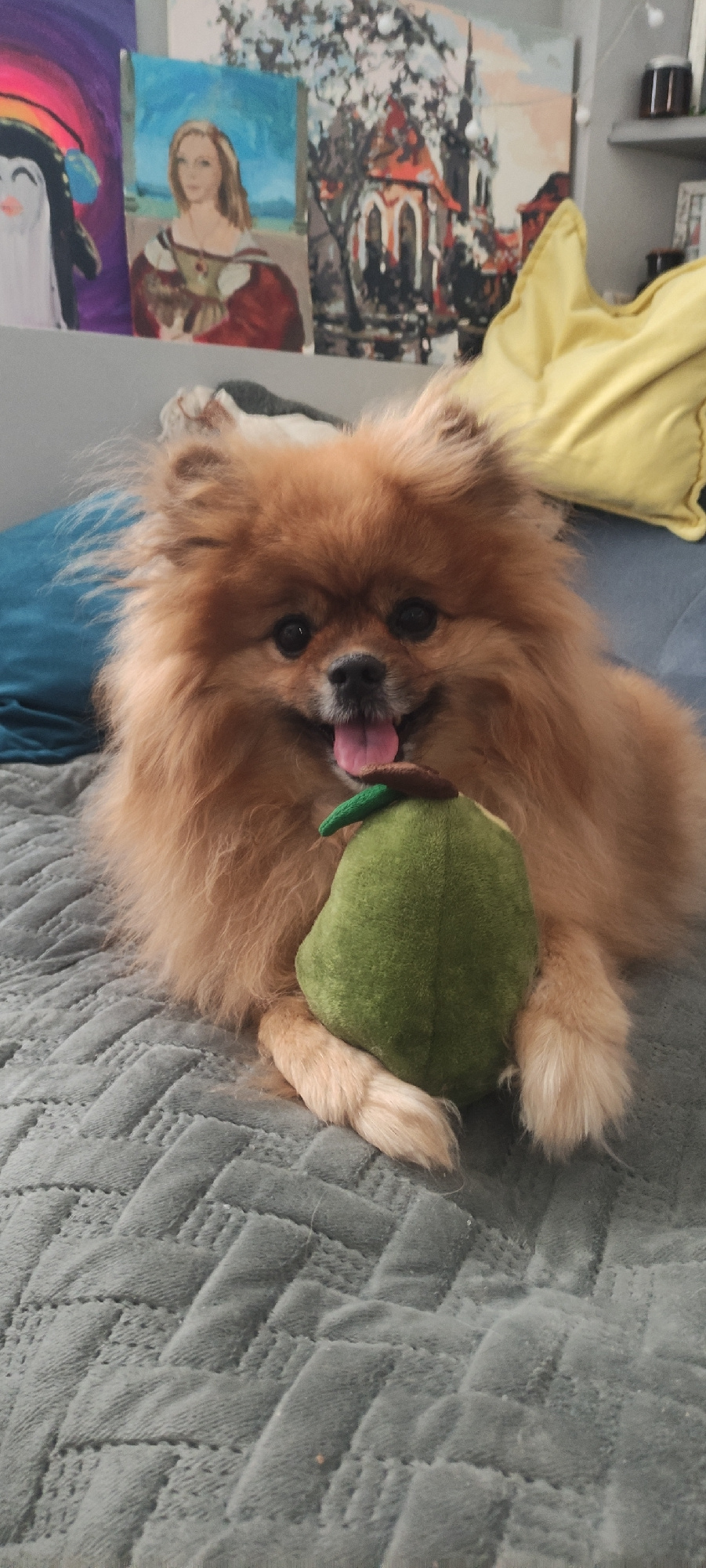 A light brown Pomeranian dog is lying on its side on a gray quilted bedspread. The dog is holding a green plush toy in its paws, and its tongue is sticking out. Behind the dog, on the left, are severa…read more