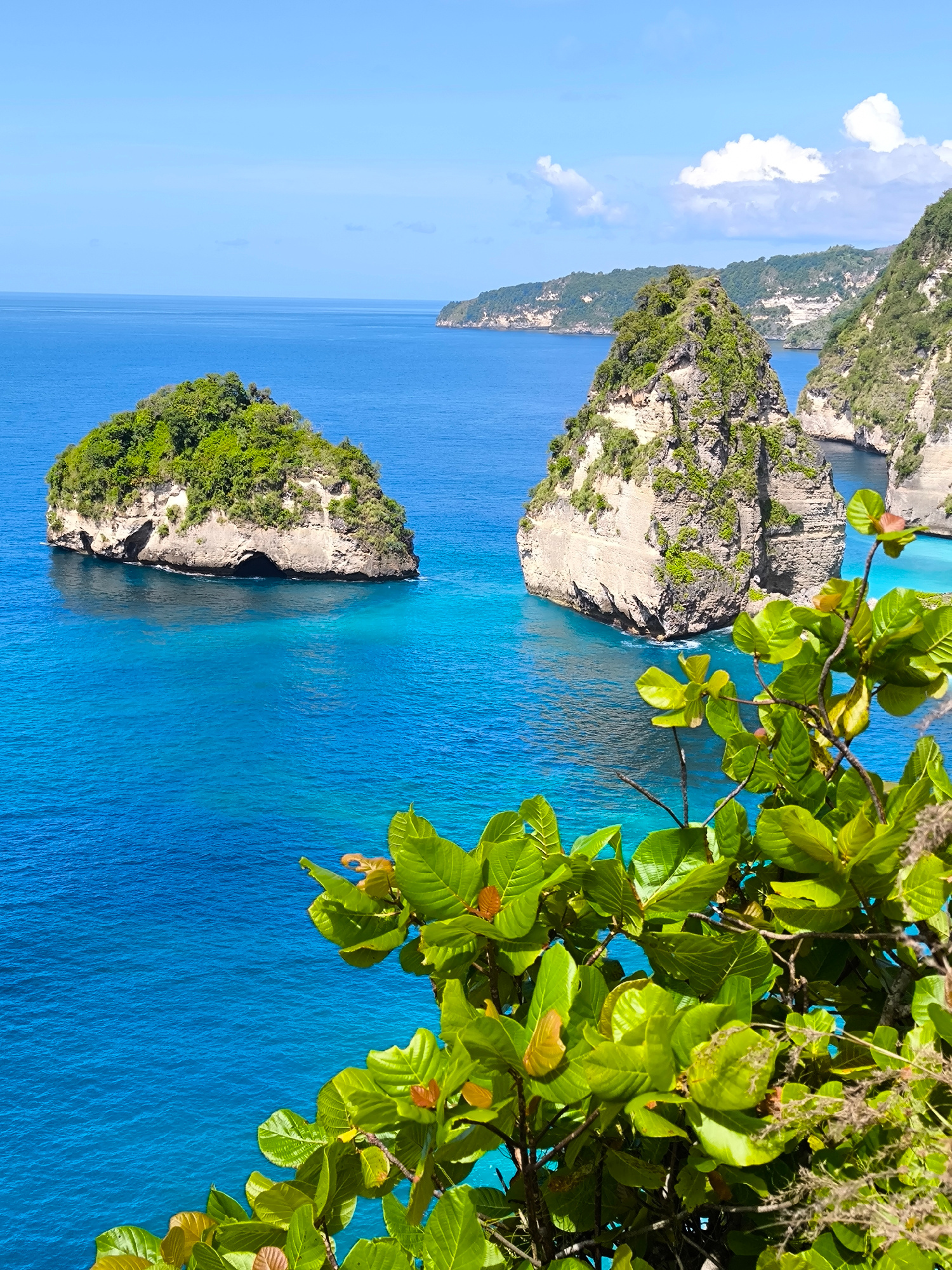 The image captures a view of the coastal landscape in Nusa Penida, Indonesia, focusing on two prominent rock formations rising from the turquoise water. One rock formation, located to the left, is top…read more