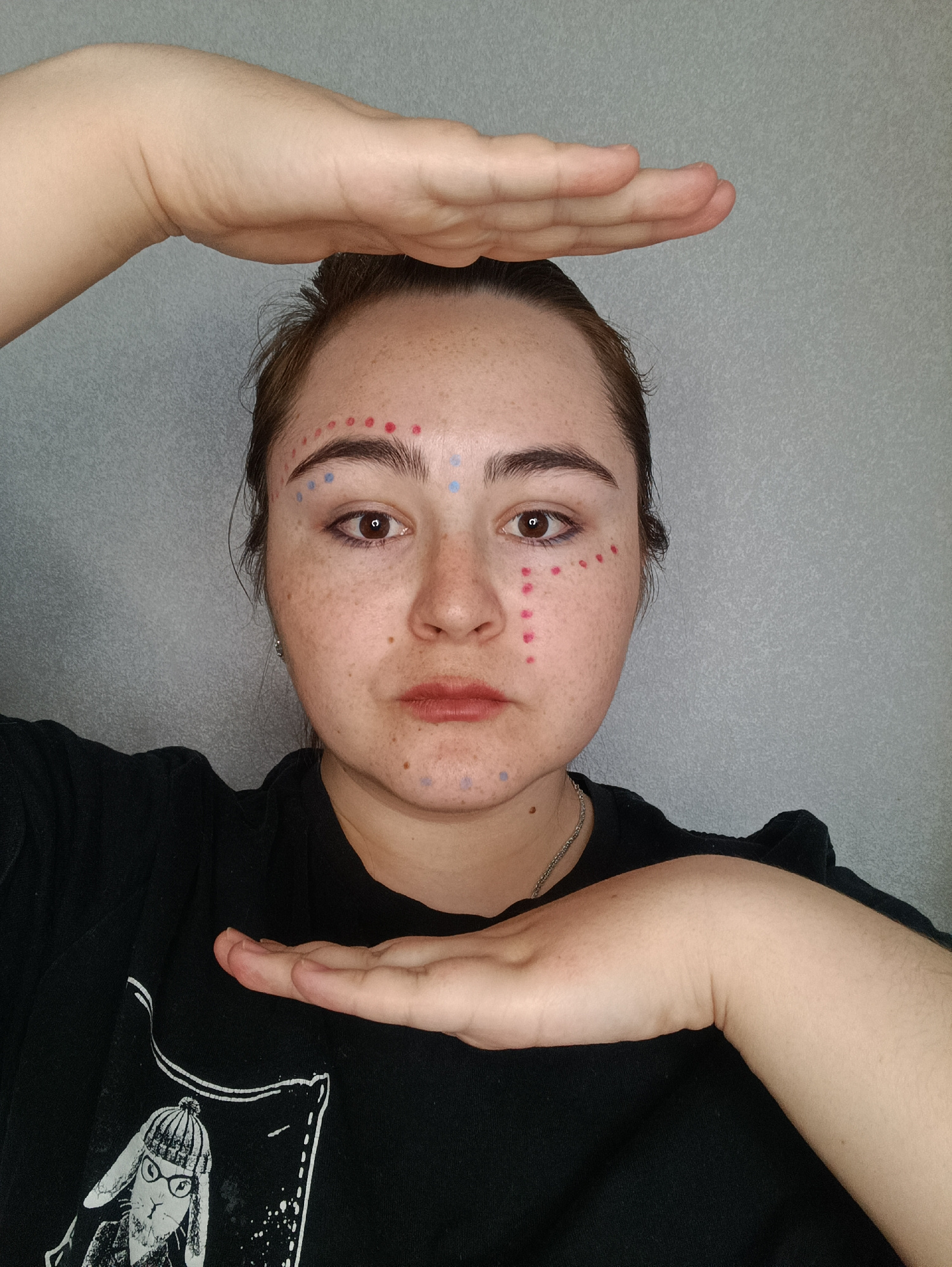 A fair-skinned person with freckles faces the camera, positioned centrally in the frame. Red and blue dots are applied to the person's face in a pattern. The individual is wearing a black t-shirt with…read more